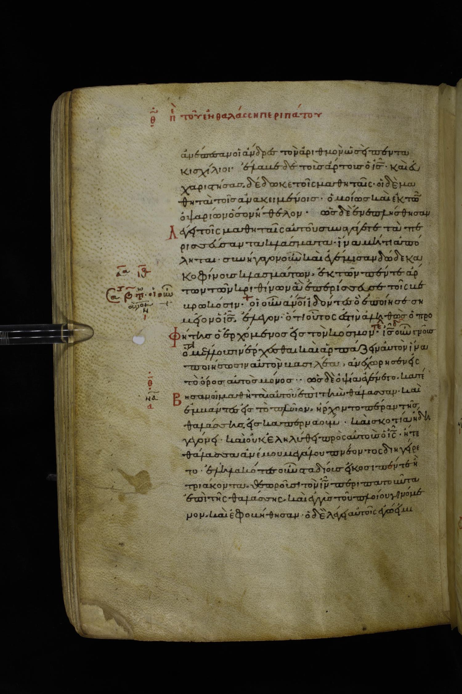 Twelfth century minuscule of the Gospels on parchment; 195 leaves, 1 column, 25 lines per column. Images were taken at the National Library of Greece in Athens.