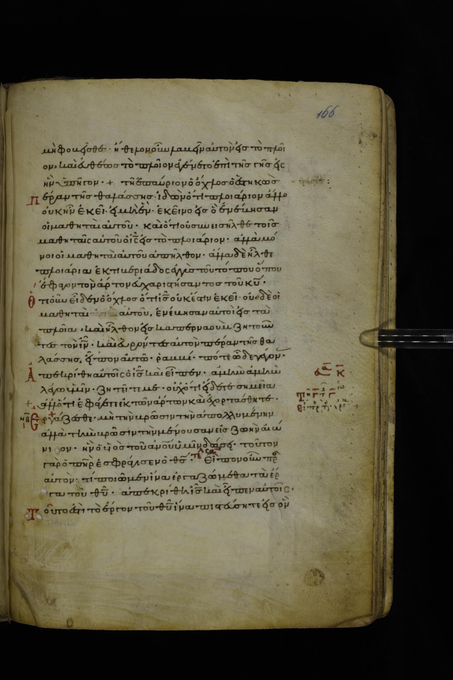 Twelfth century minuscule of the Gospels on parchment; 195 leaves, 1 column, 25 lines per column. Images were taken at the National Library of Greece in Athens.