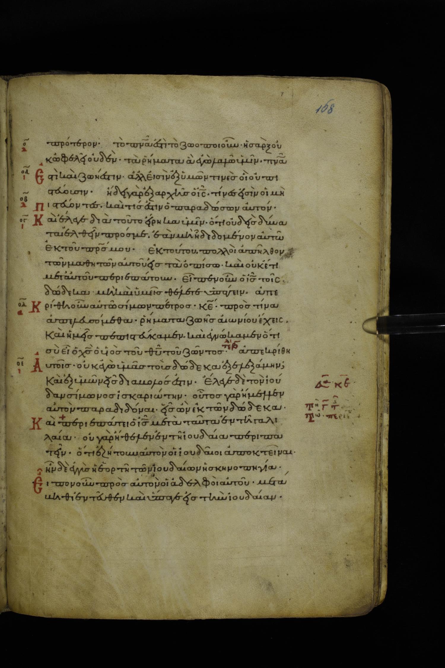 Twelfth century minuscule of the Gospels on parchment; 195 leaves, 1 column, 25 lines per column. Images were taken at the National Library of Greece in Athens.