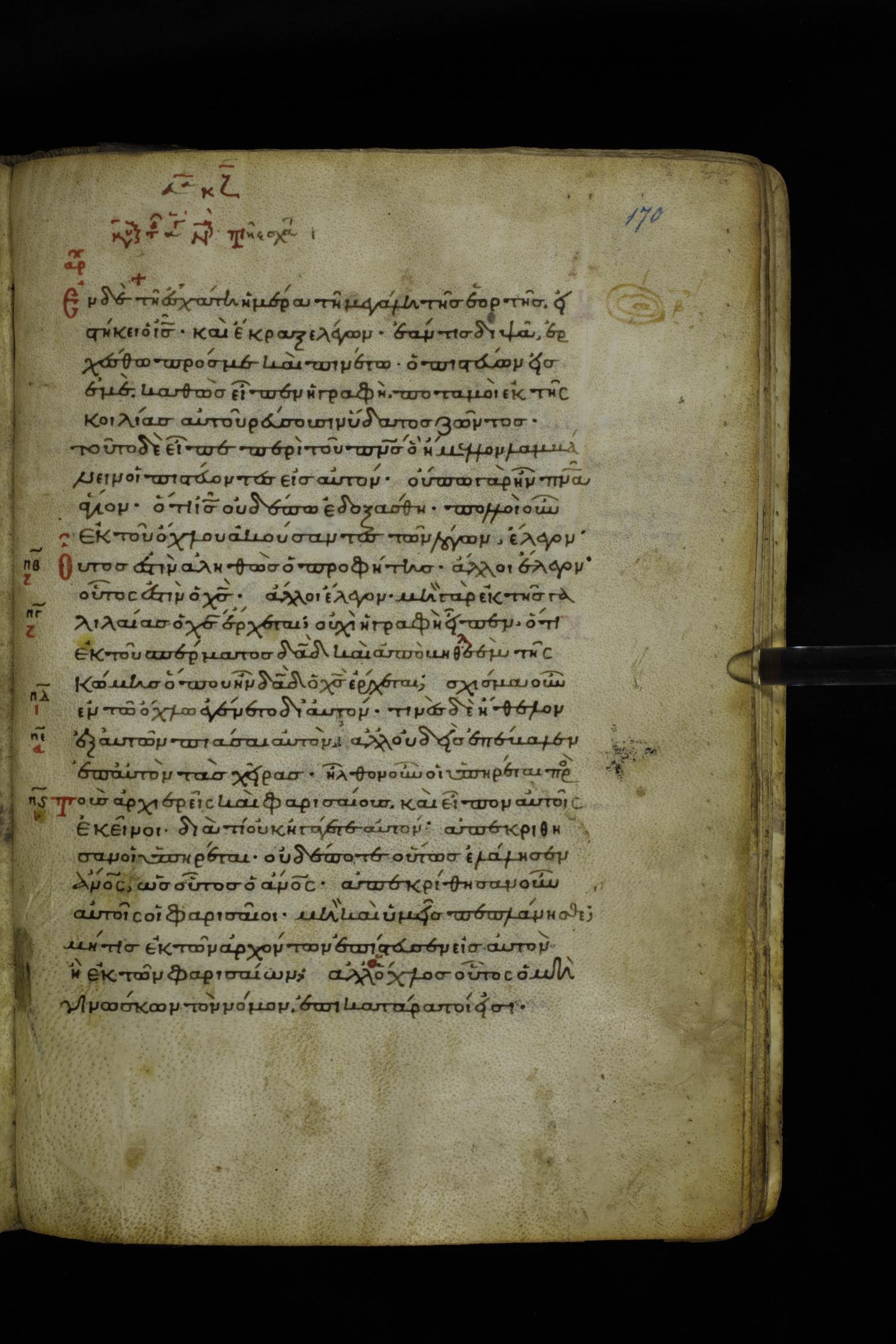 Twelfth century minuscule of the Gospels on parchment; 195 leaves, 1 column, 25 lines per column. Images were taken at the National Library of Greece in Athens.