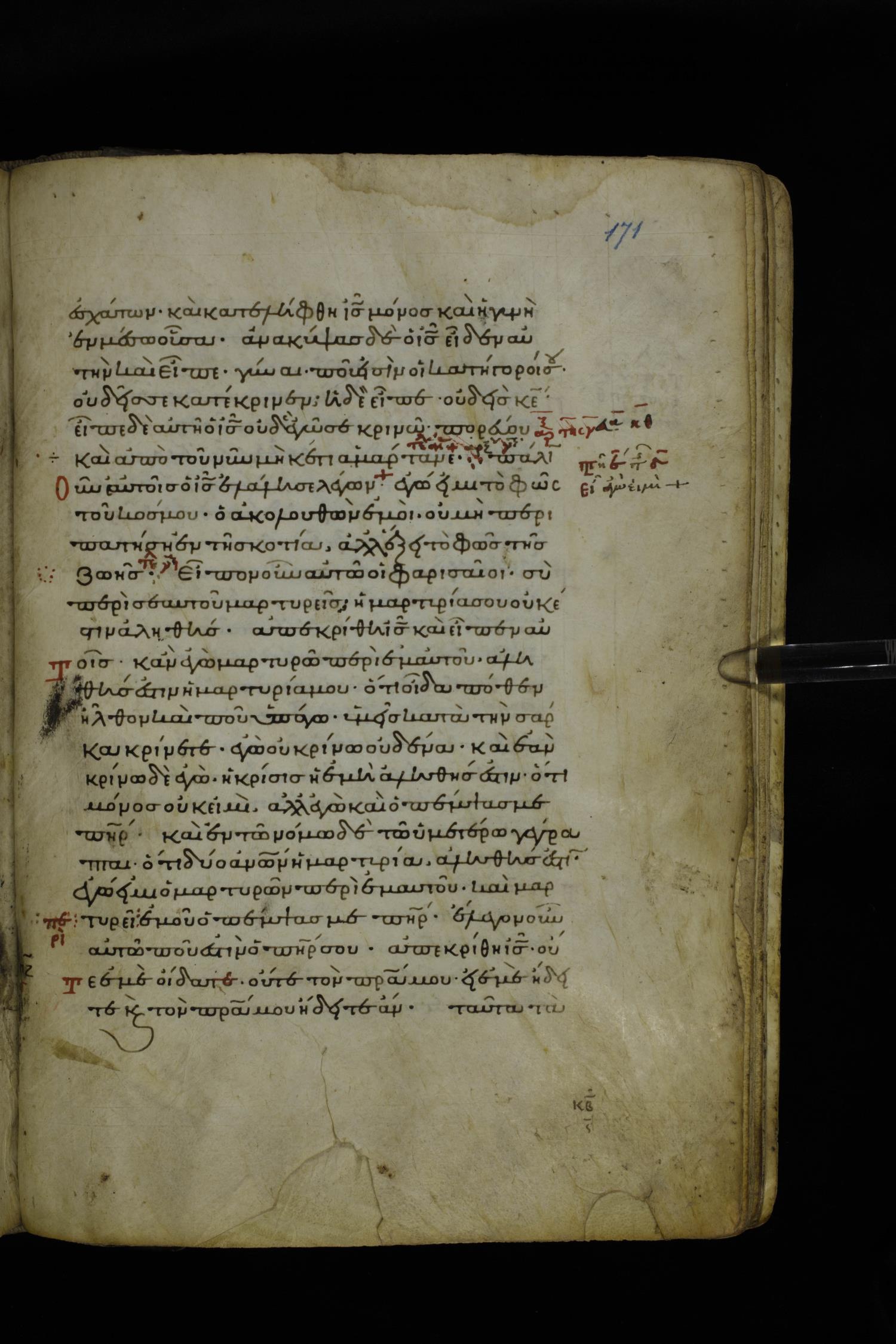 Twelfth century minuscule of the Gospels on parchment; 195 leaves, 1 column, 25 lines per column. Images were taken at the National Library of Greece in Athens.