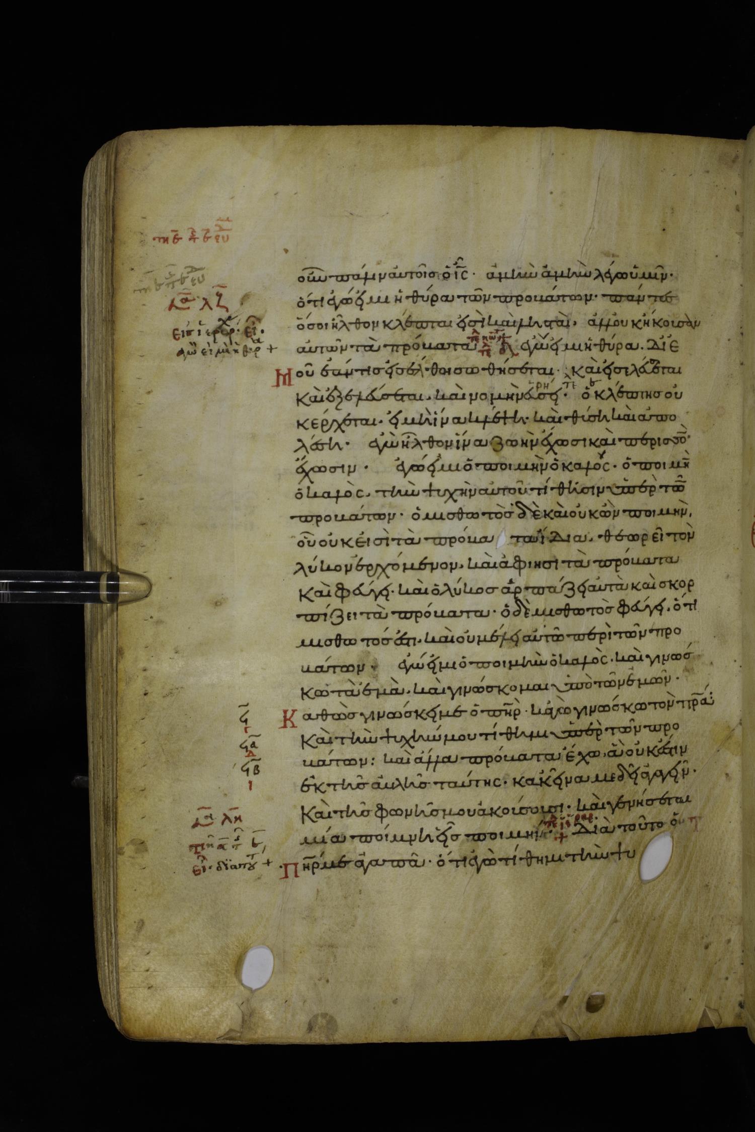Twelfth century minuscule of the Gospels on parchment; 195 leaves, 1 column, 25 lines per column. Images were taken at the National Library of Greece in Athens.