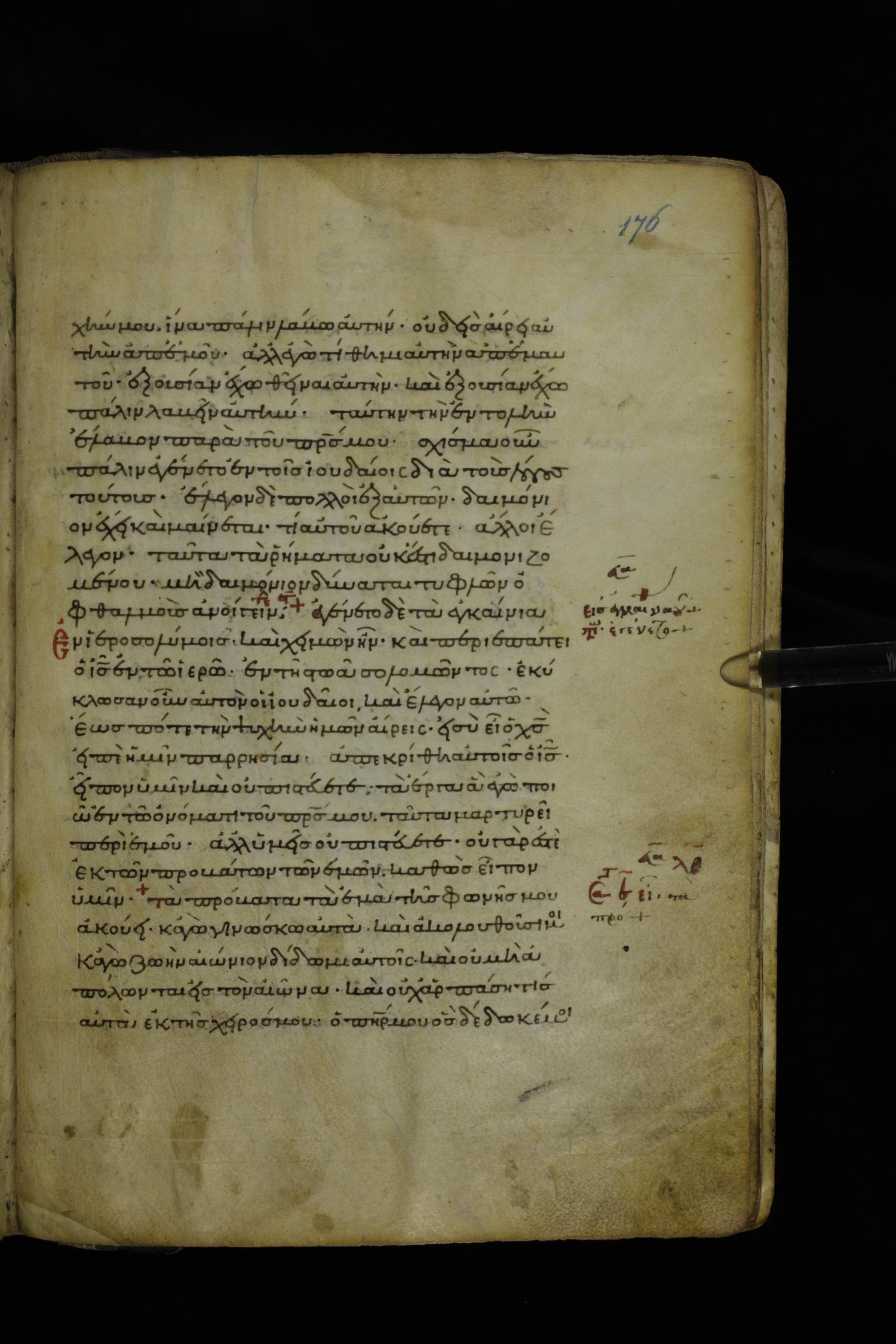 Twelfth century minuscule of the Gospels on parchment; 195 leaves, 1 column, 25 lines per column. Images were taken at the National Library of Greece in Athens.