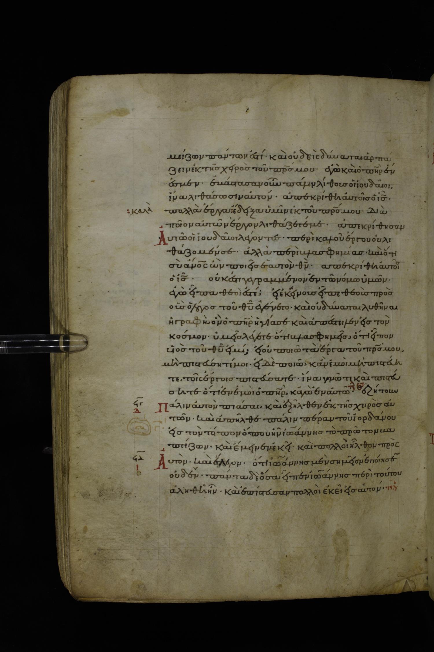 Twelfth century minuscule of the Gospels on parchment; 195 leaves, 1 column, 25 lines per column. Images were taken at the National Library of Greece in Athens.