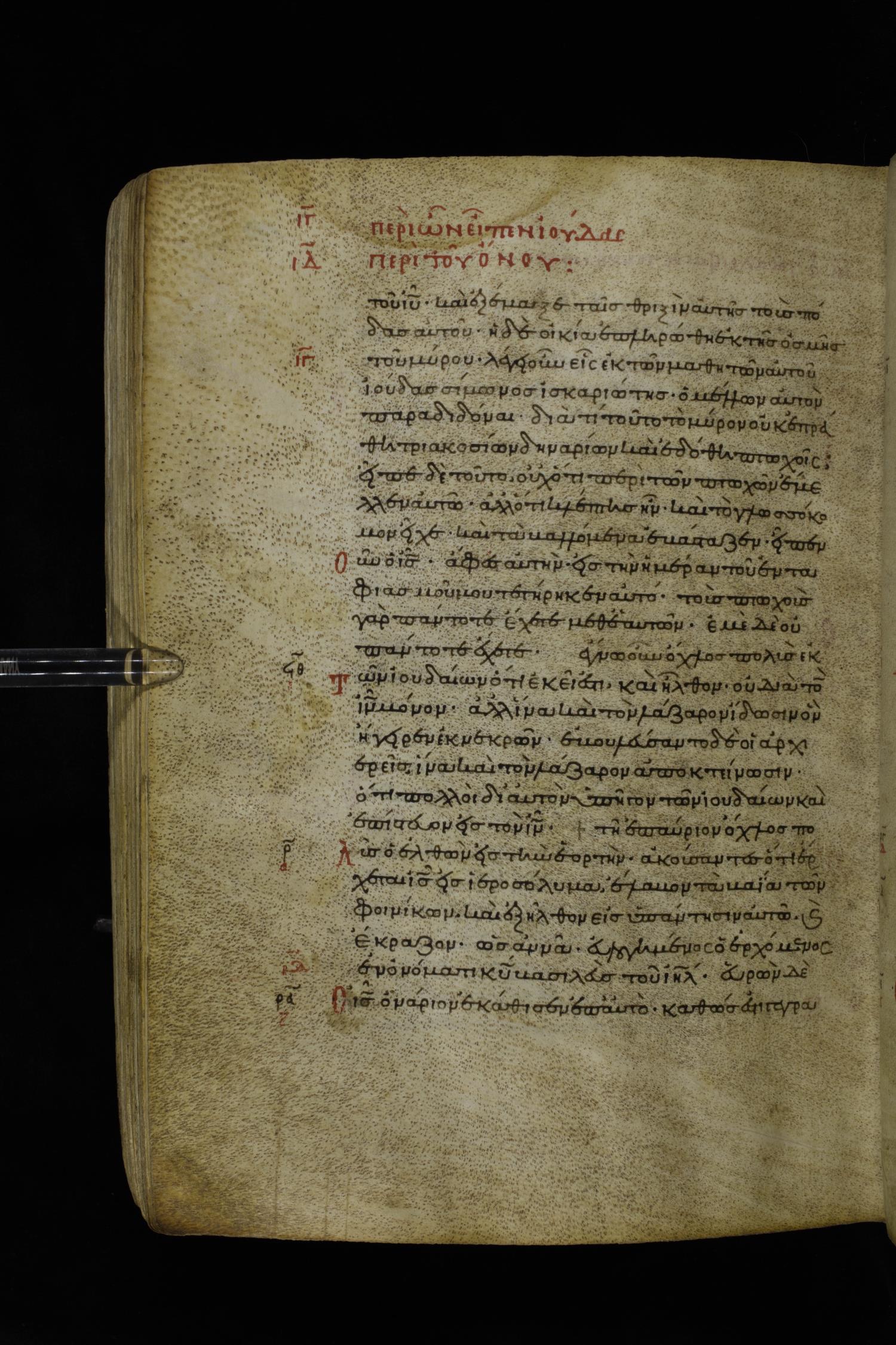 Twelfth century minuscule of the Gospels on parchment; 195 leaves, 1 column, 25 lines per column. Images were taken at the National Library of Greece in Athens.