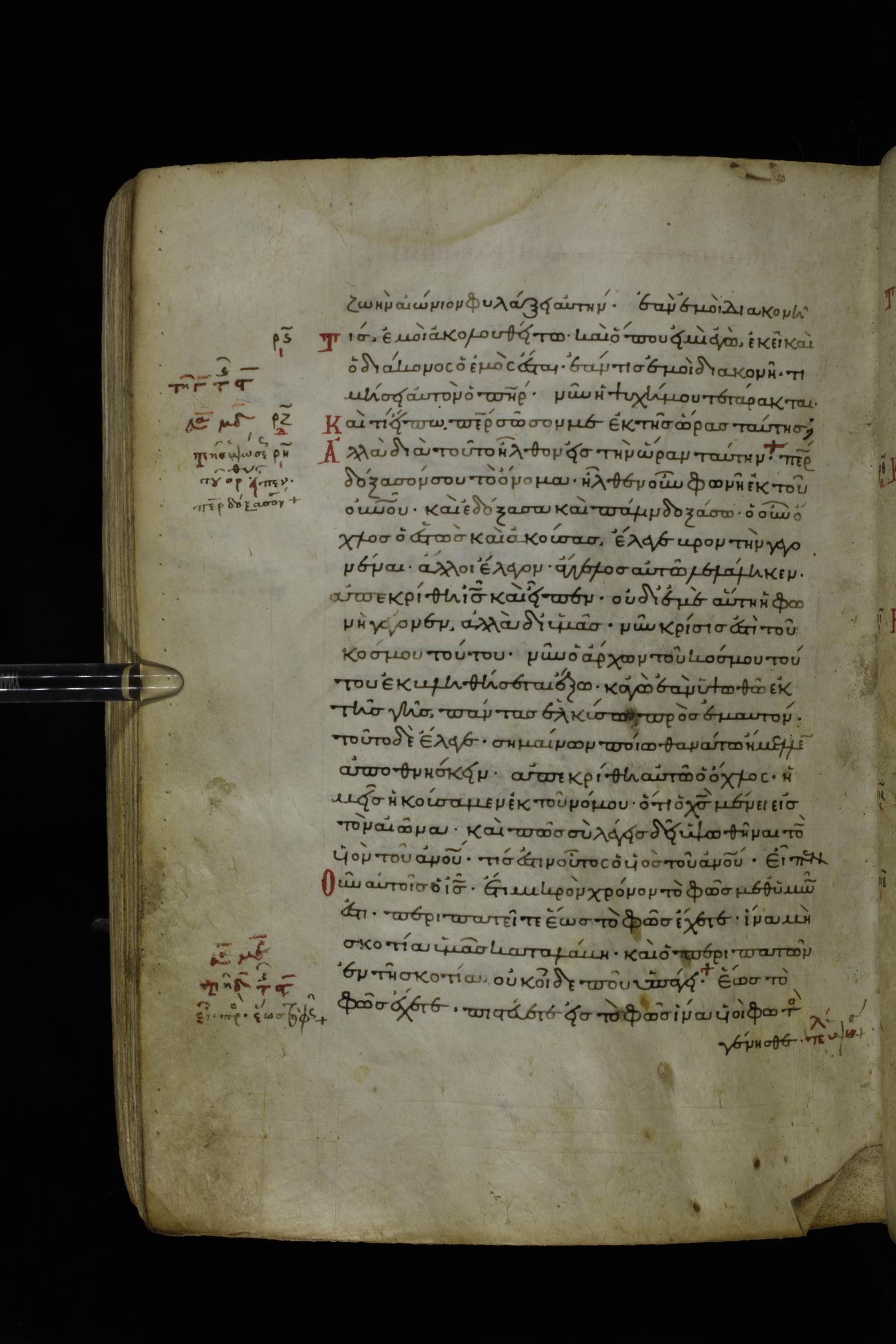 Twelfth century minuscule of the Gospels on parchment; 195 leaves, 1 column, 25 lines per column. Images were taken at the National Library of Greece in Athens.