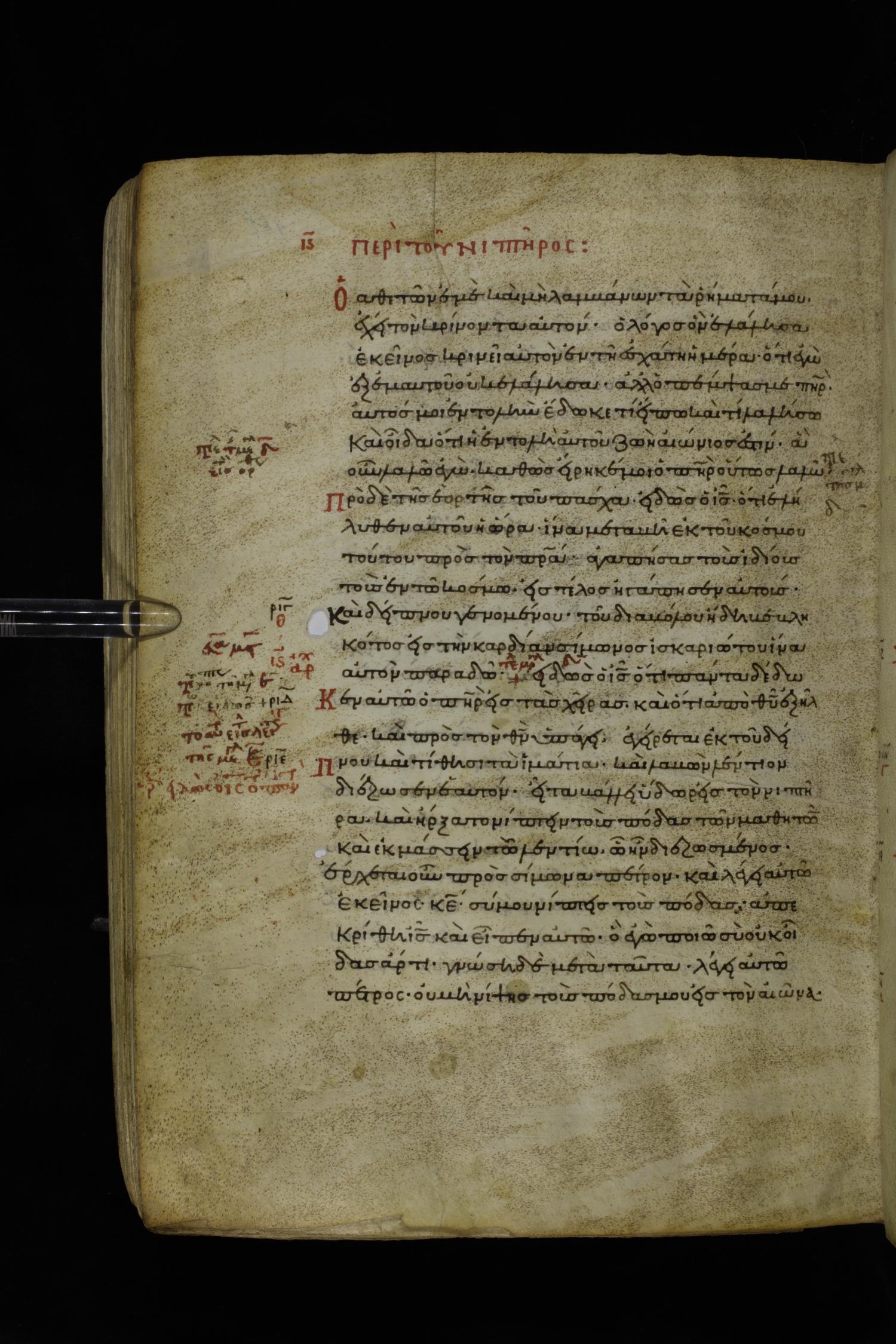 Twelfth century minuscule of the Gospels on parchment; 195 leaves, 1 column, 25 lines per column. Images were taken at the National Library of Greece in Athens.
