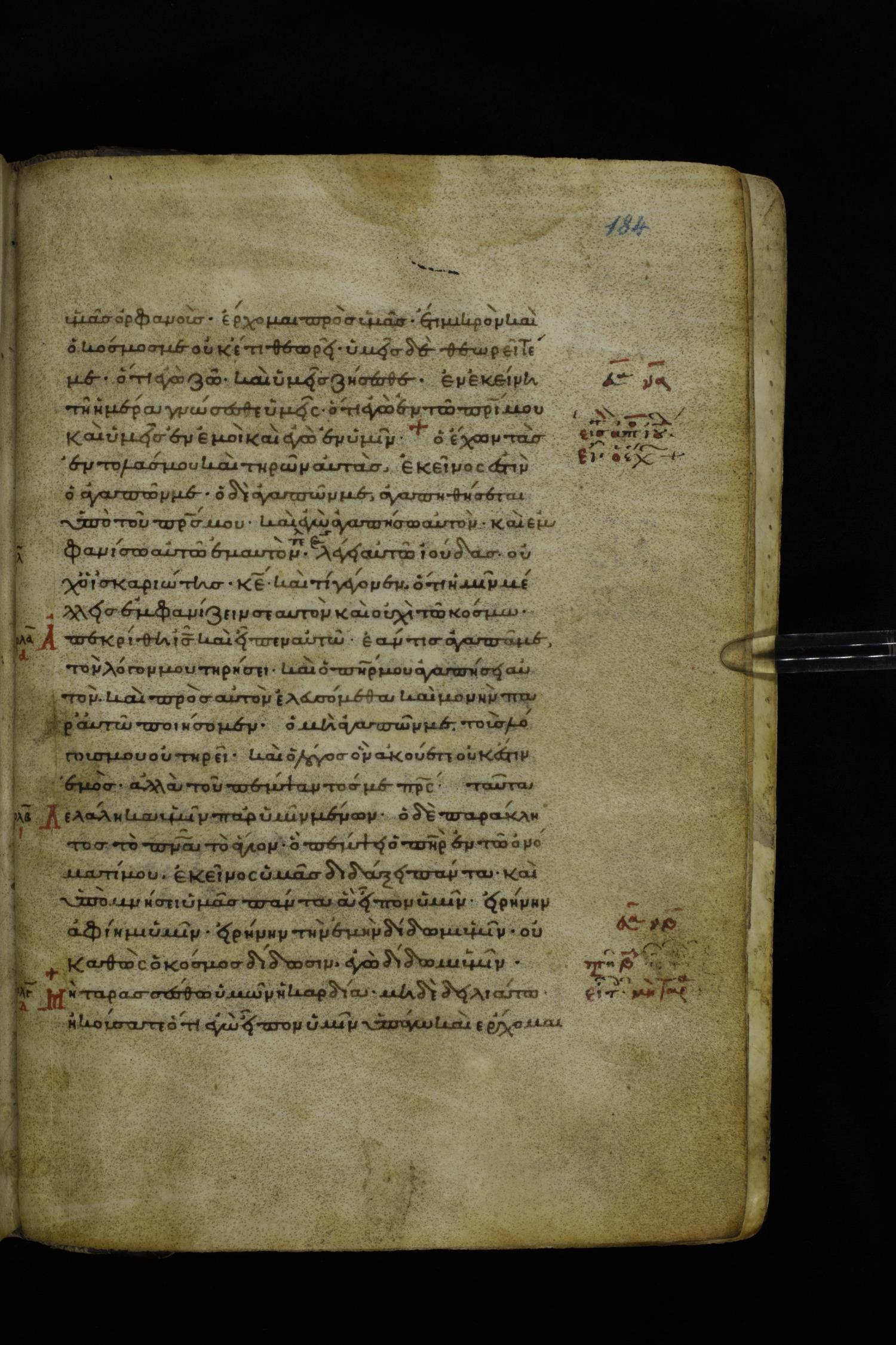 Twelfth century minuscule of the Gospels on parchment; 195 leaves, 1 column, 25 lines per column. Images were taken at the National Library of Greece in Athens.