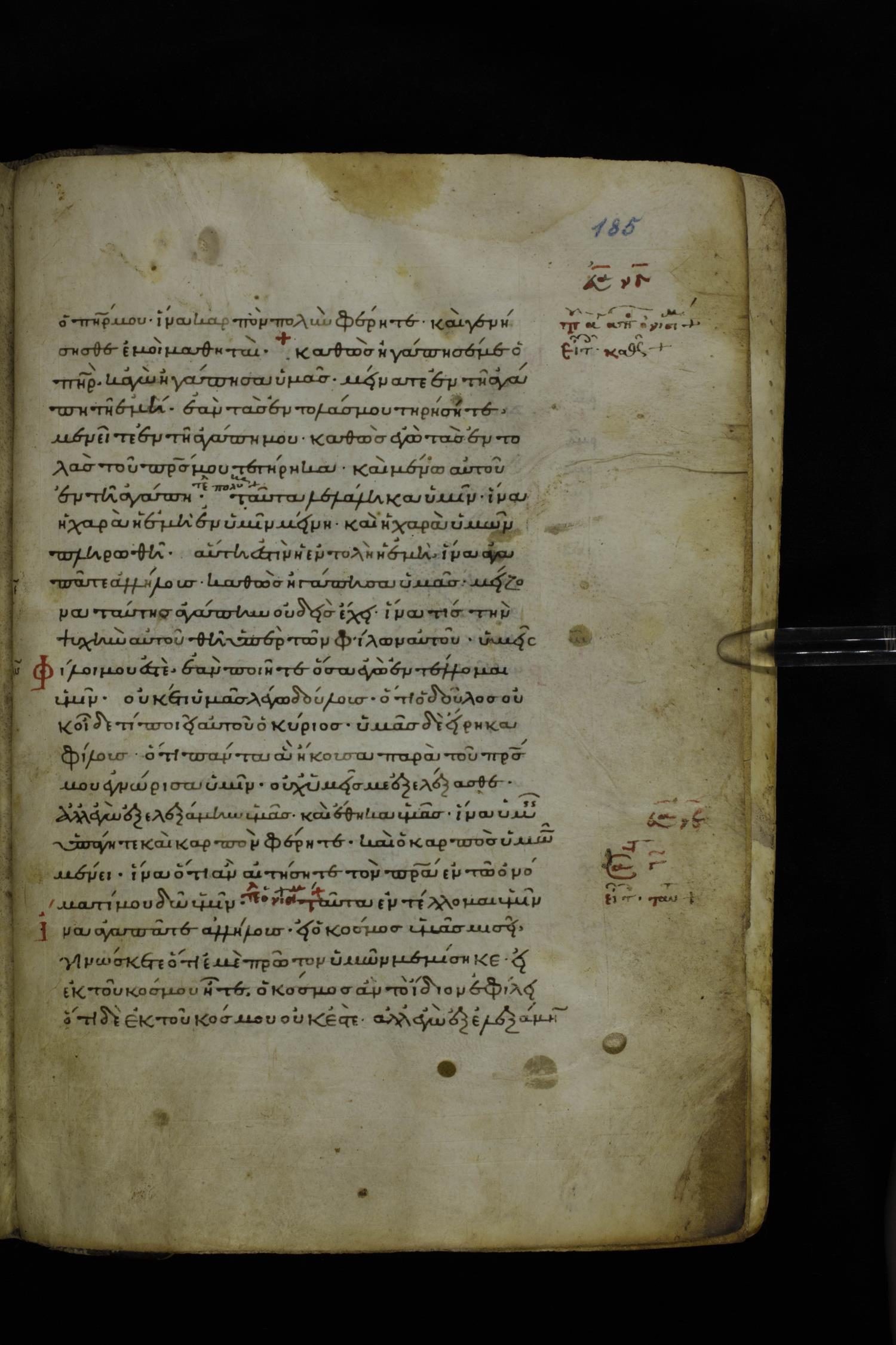 Twelfth century minuscule of the Gospels on parchment; 195 leaves, 1 column, 25 lines per column. Images were taken at the National Library of Greece in Athens.