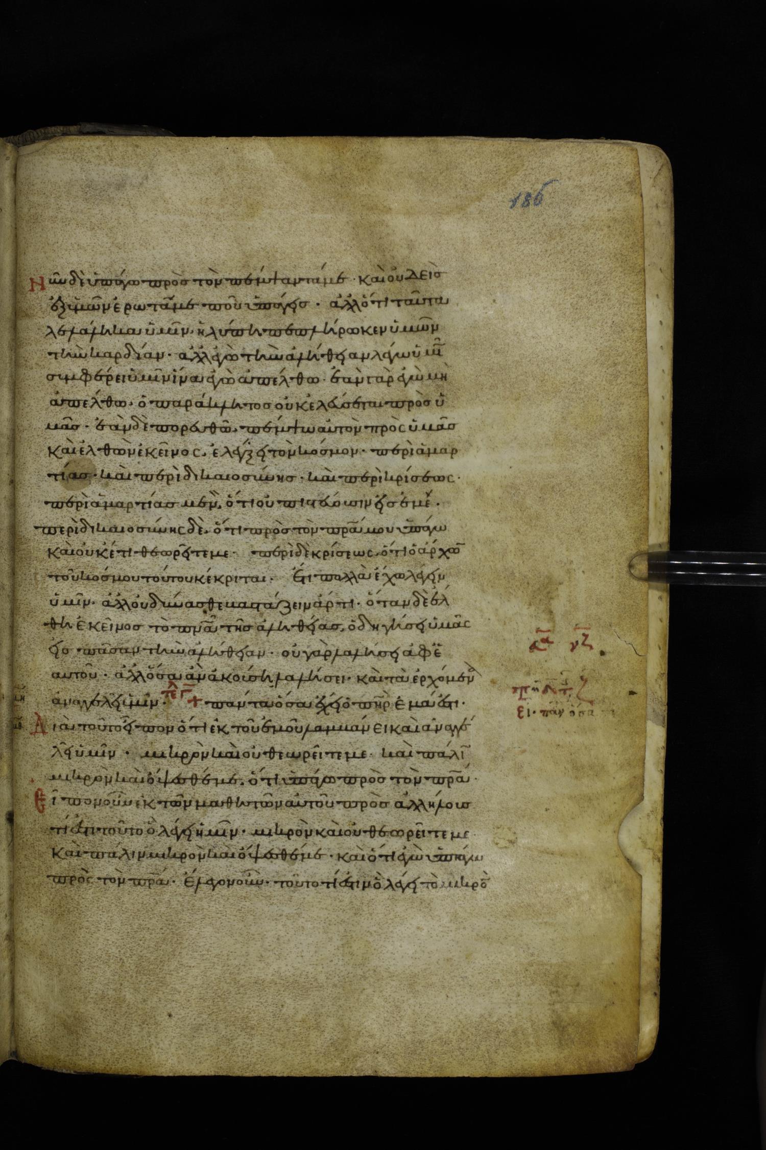 Twelfth century minuscule of the Gospels on parchment; 195 leaves, 1 column, 25 lines per column. Images were taken at the National Library of Greece in Athens.