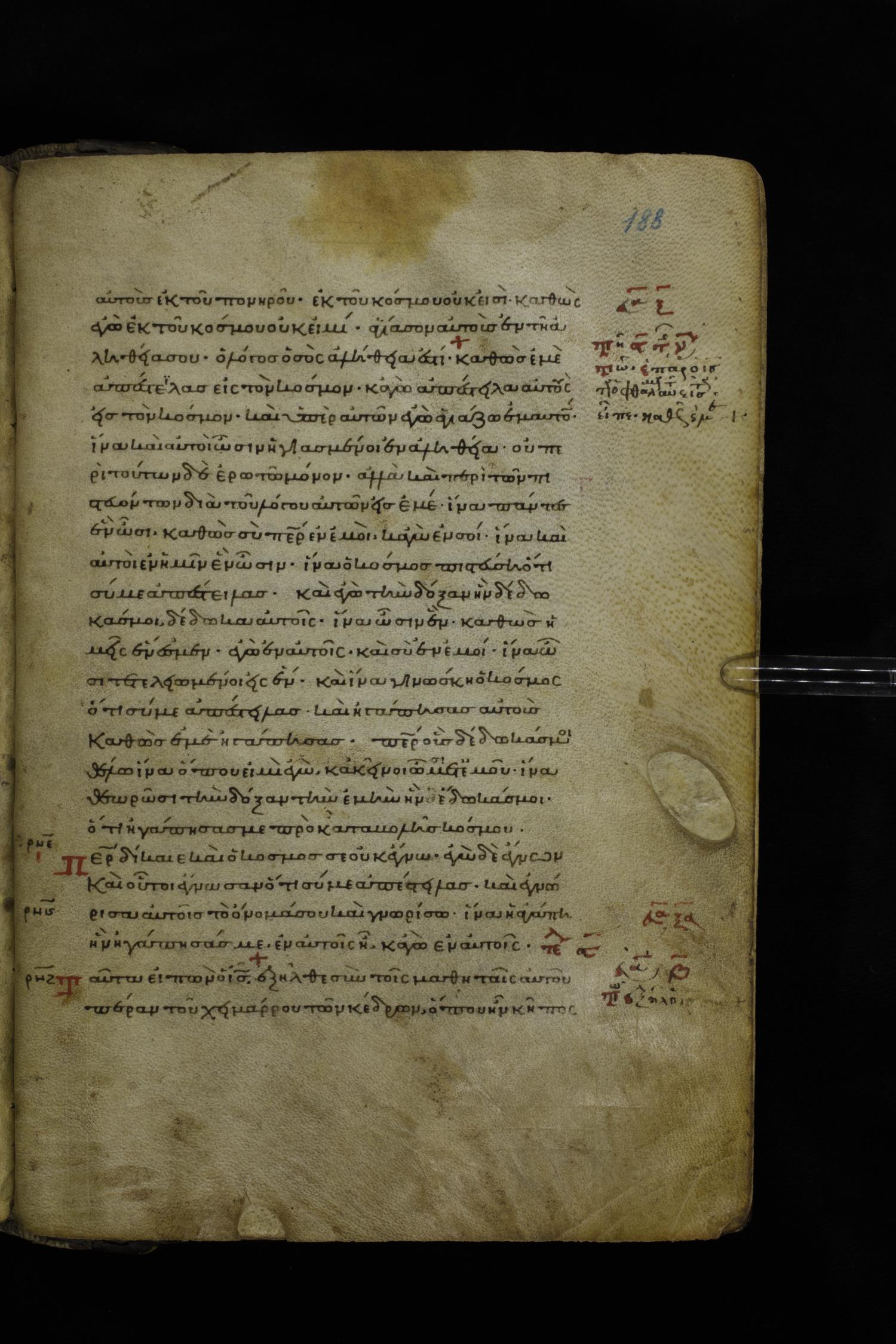 Twelfth century minuscule of the Gospels on parchment; 195 leaves, 1 column, 25 lines per column. Images were taken at the National Library of Greece in Athens.