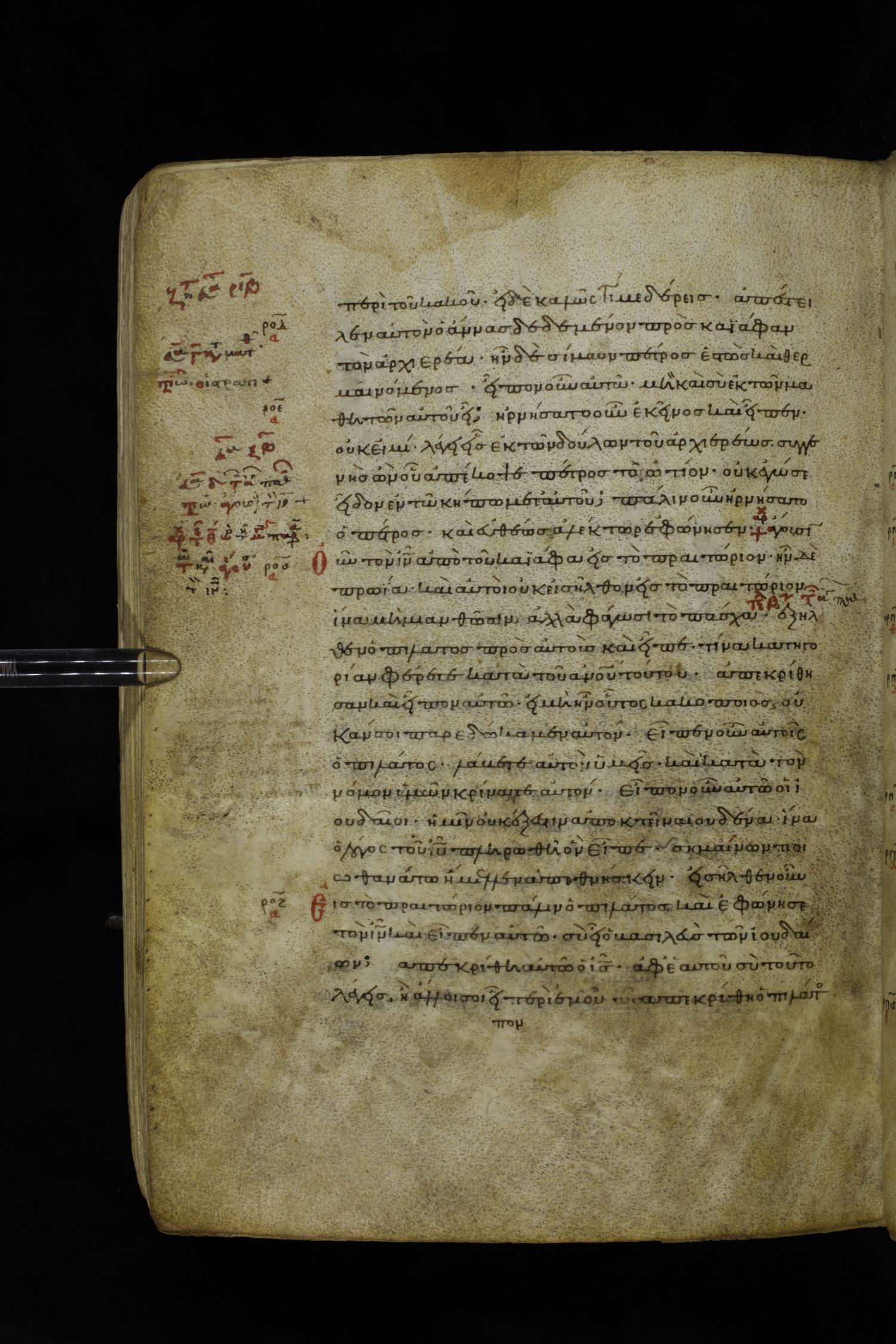 Twelfth century minuscule of the Gospels on parchment; 195 leaves, 1 column, 25 lines per column. Images were taken at the National Library of Greece in Athens.