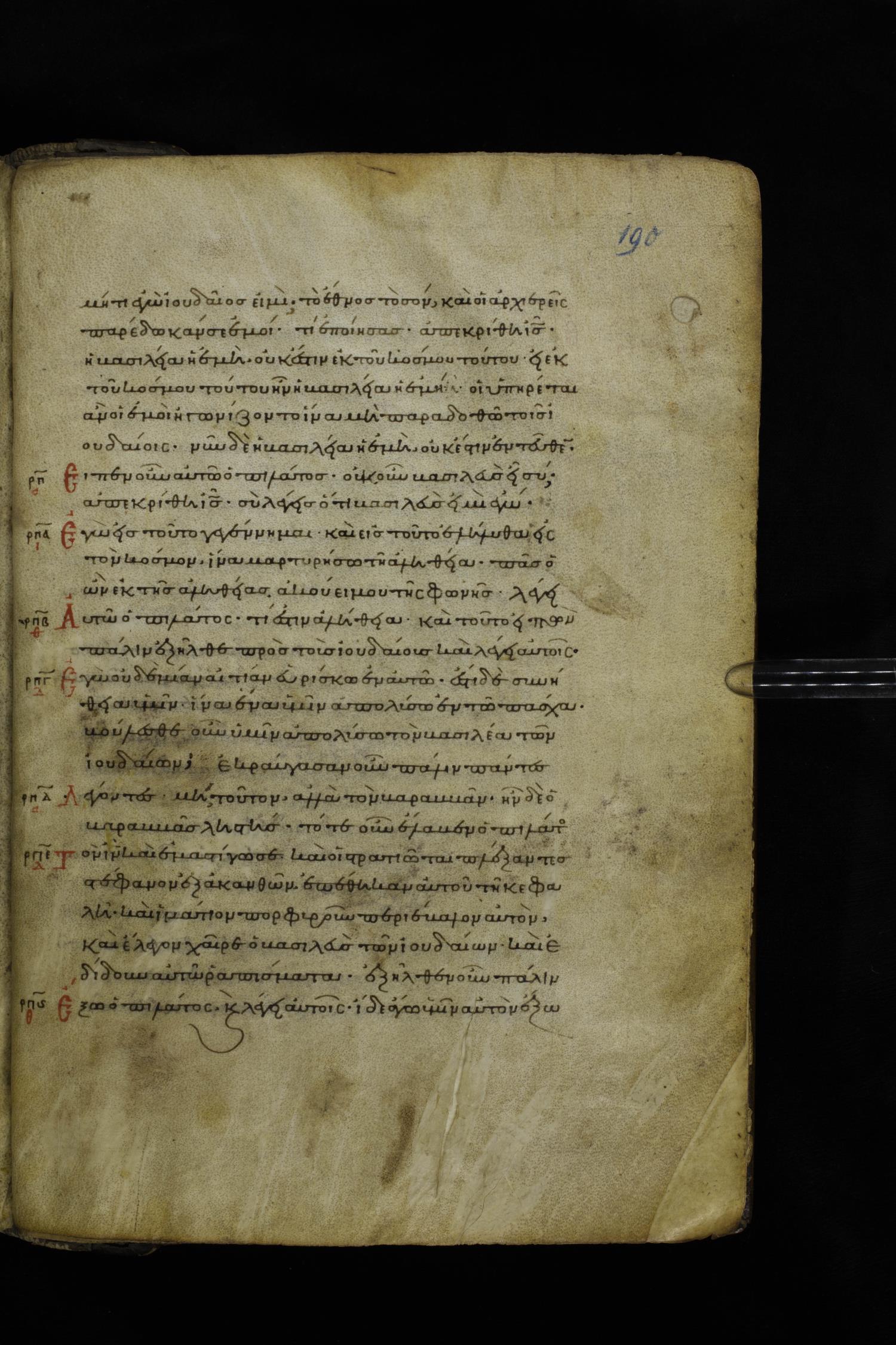 Twelfth century minuscule of the Gospels on parchment; 195 leaves, 1 column, 25 lines per column. Images were taken at the National Library of Greece in Athens.