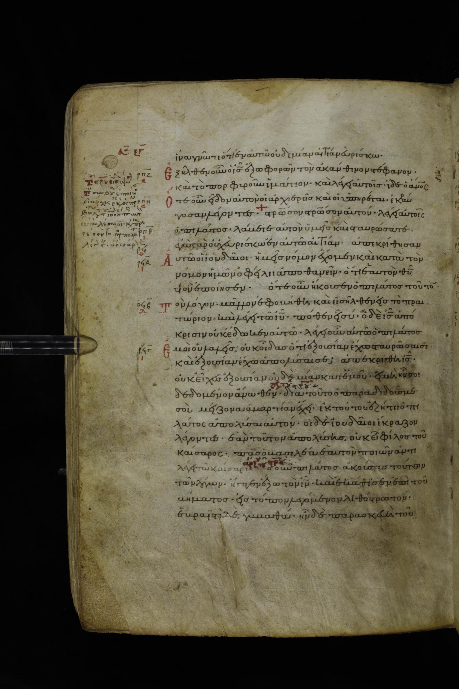 Twelfth century minuscule of the Gospels on parchment; 195 leaves, 1 column, 25 lines per column. Images were taken at the National Library of Greece in Athens.