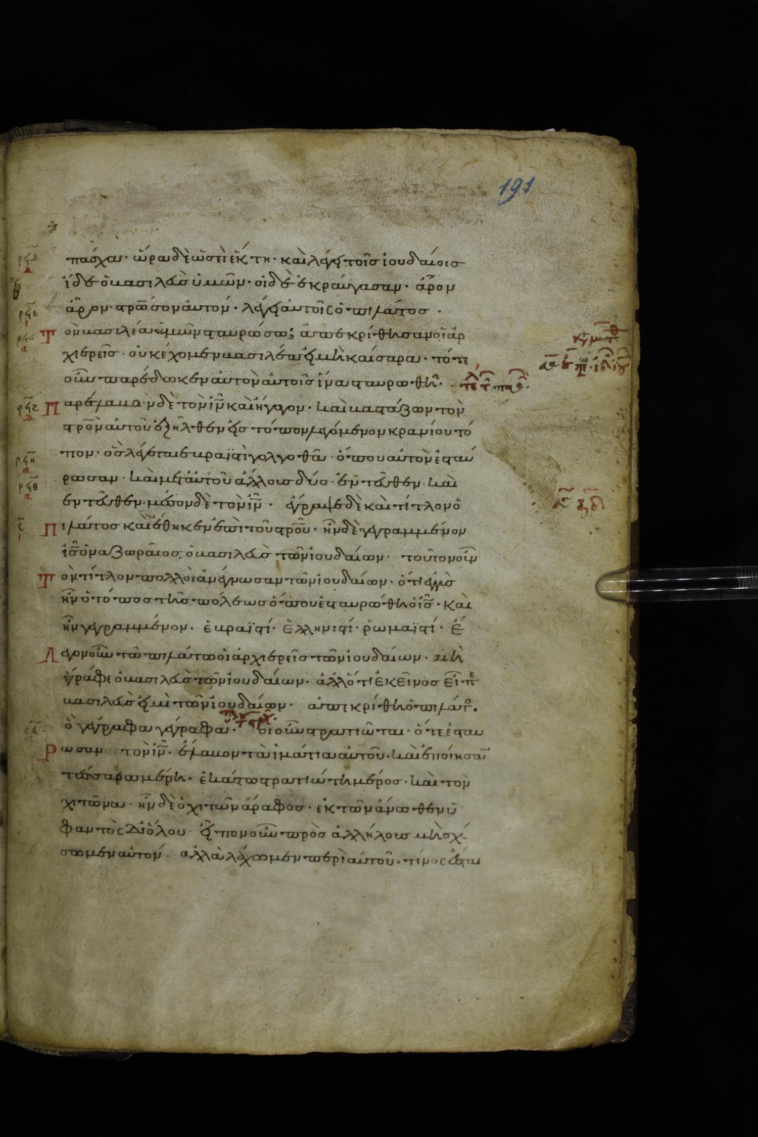 Twelfth century minuscule of the Gospels on parchment; 195 leaves, 1 column, 25 lines per column. Images were taken at the National Library of Greece in Athens.