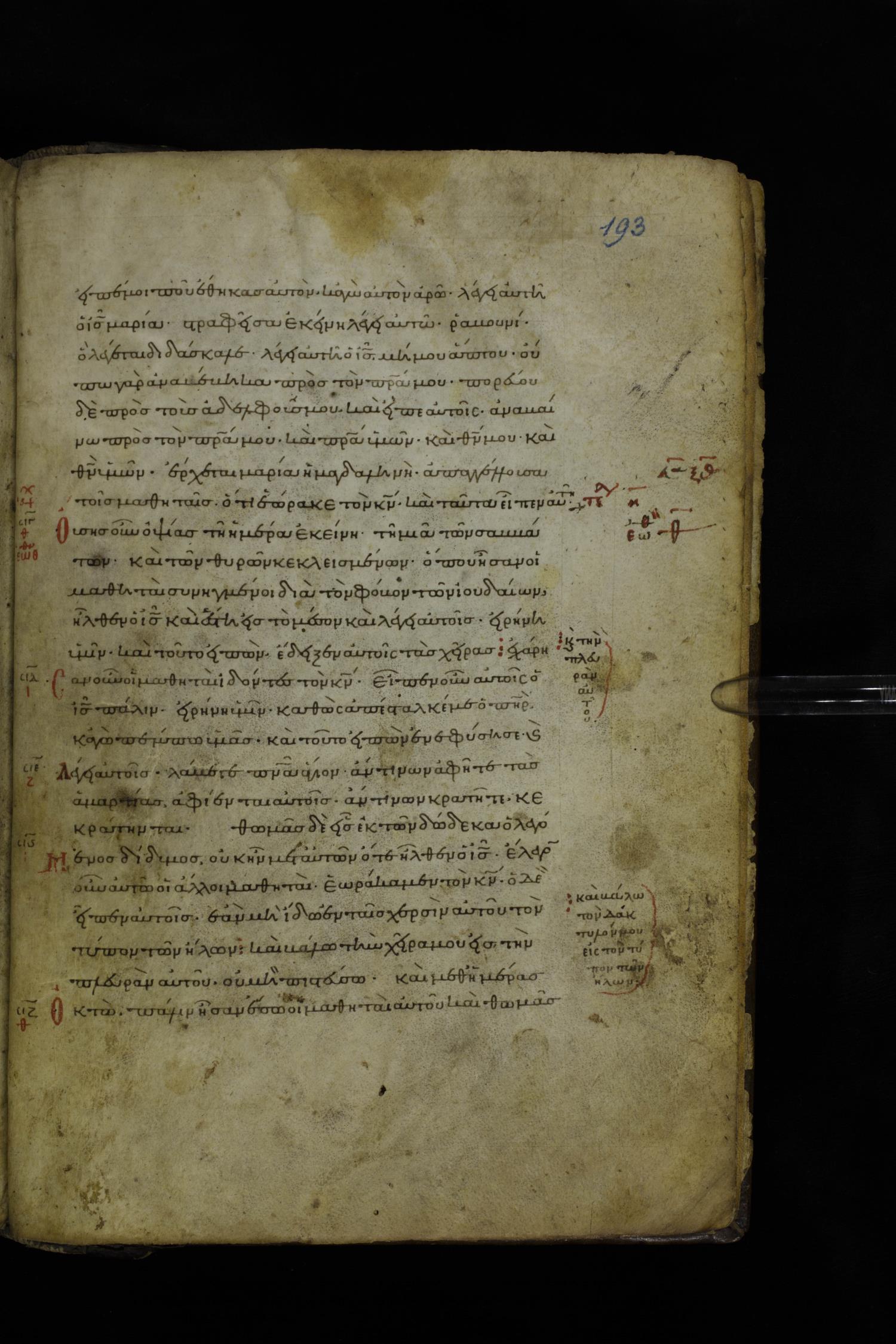 Twelfth century minuscule of the Gospels on parchment; 195 leaves, 1 column, 25 lines per column. Images were taken at the National Library of Greece in Athens.