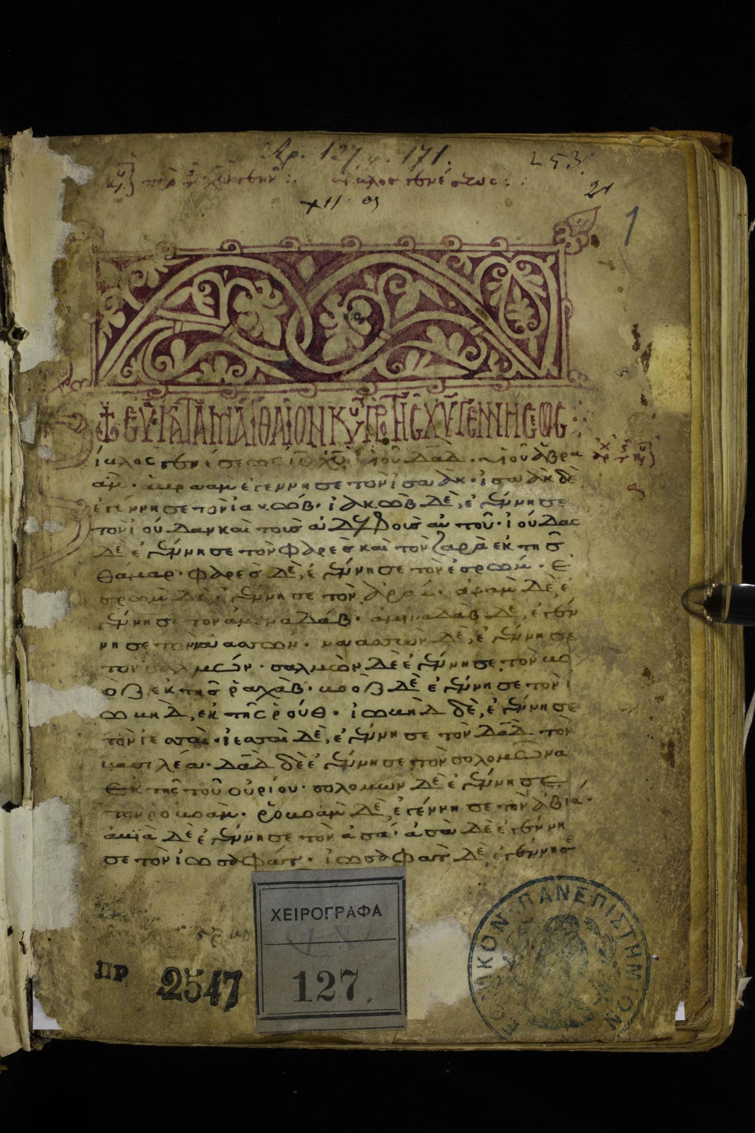 Twelfth or thirteenth century minuscule of the Gospels on parchment; 171 leaves, 1 column, 26-28 lines per column. Images were taken at the National Library of Greece in Athens.