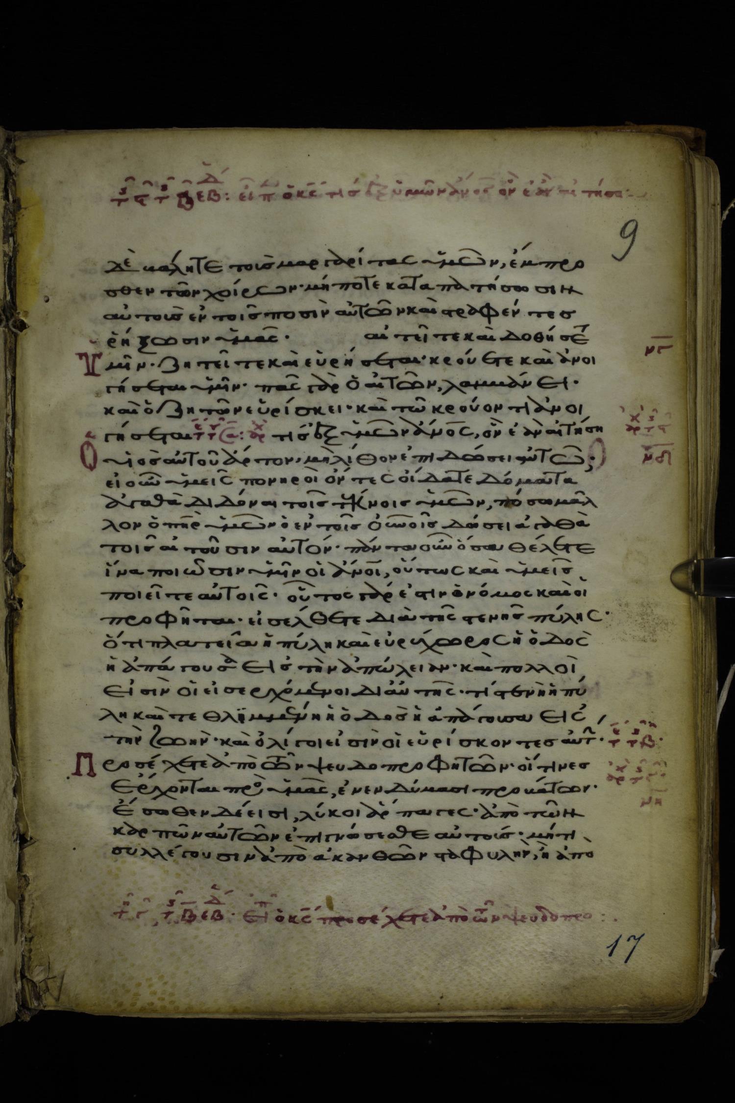 Twelfth or thirteenth century minuscule of the Gospels on parchment; 171 leaves, 1 column, 26-28 lines per column. Images were taken at the National Library of Greece in Athens.