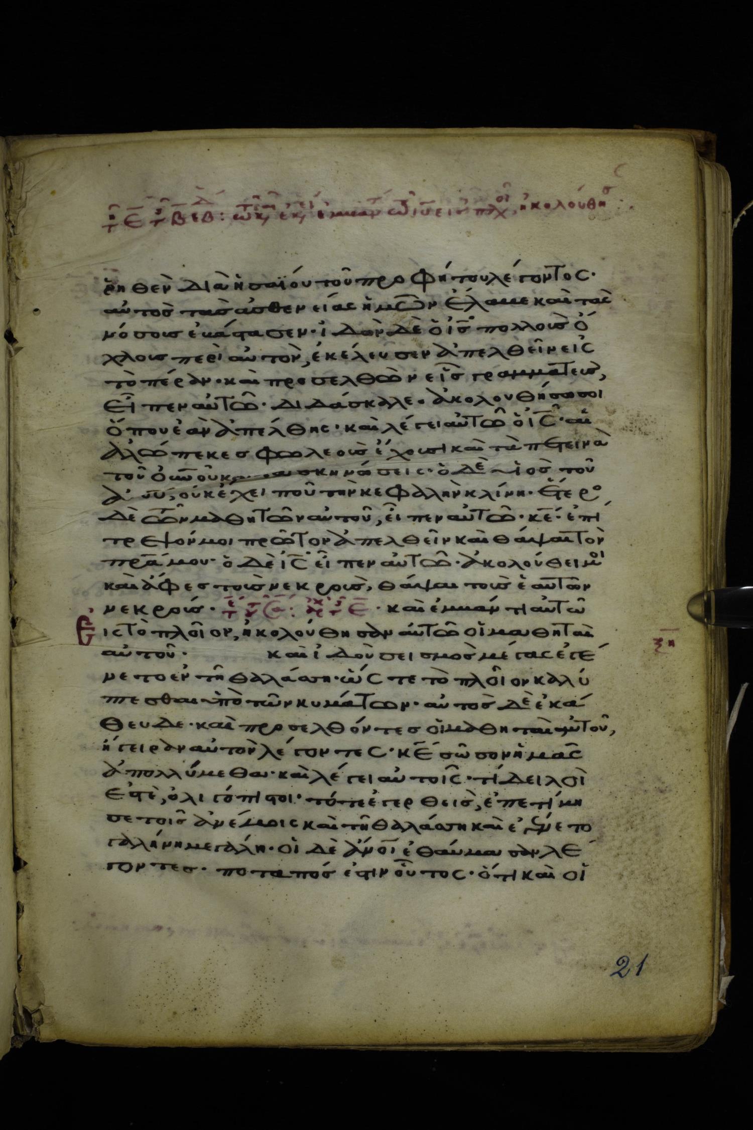 Twelfth or thirteenth century minuscule of the Gospels on parchment; 171 leaves, 1 column, 26-28 lines per column. Images were taken at the National Library of Greece in Athens.