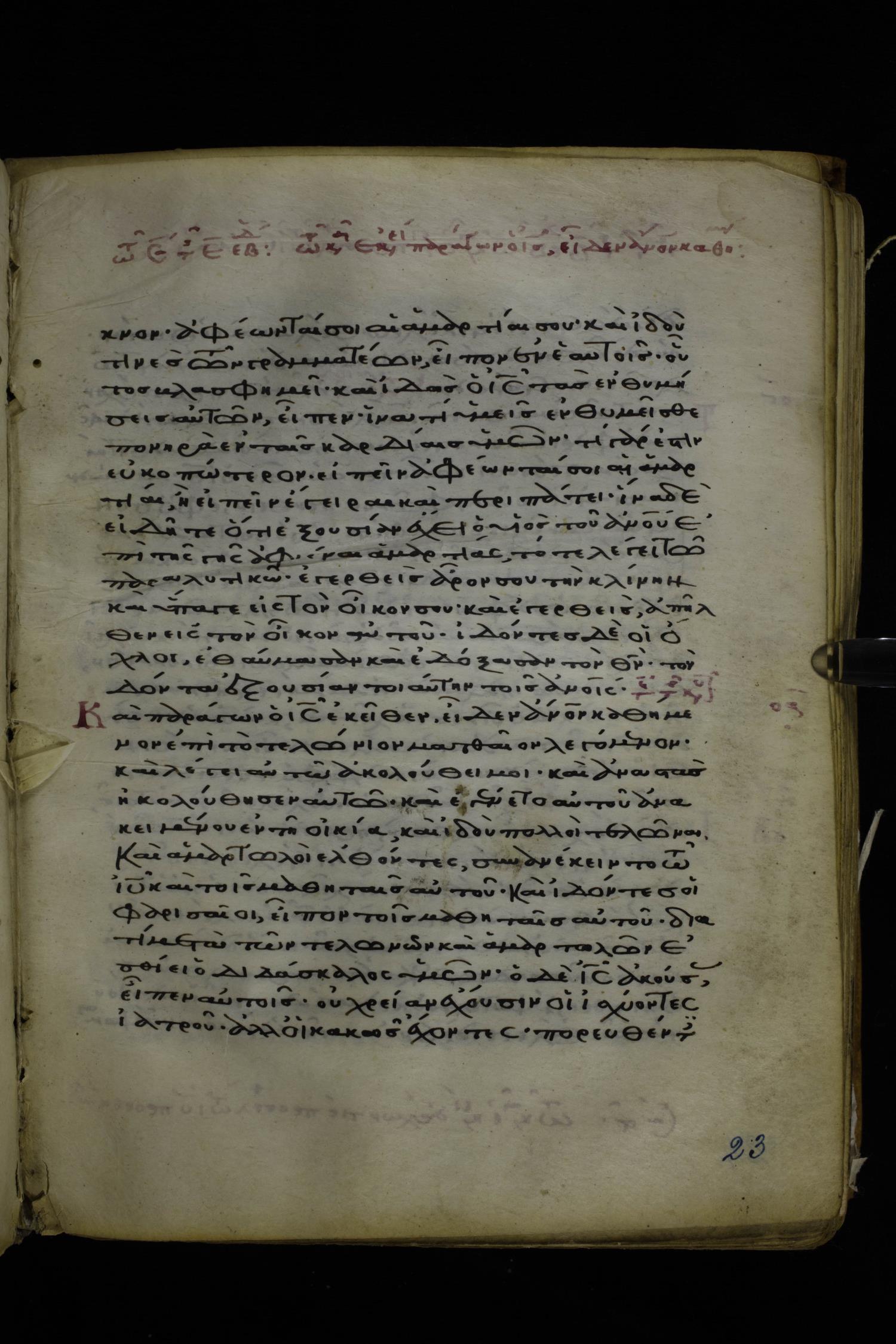Twelfth or thirteenth century minuscule of the Gospels on parchment; 171 leaves, 1 column, 26-28 lines per column. Images were taken at the National Library of Greece in Athens.