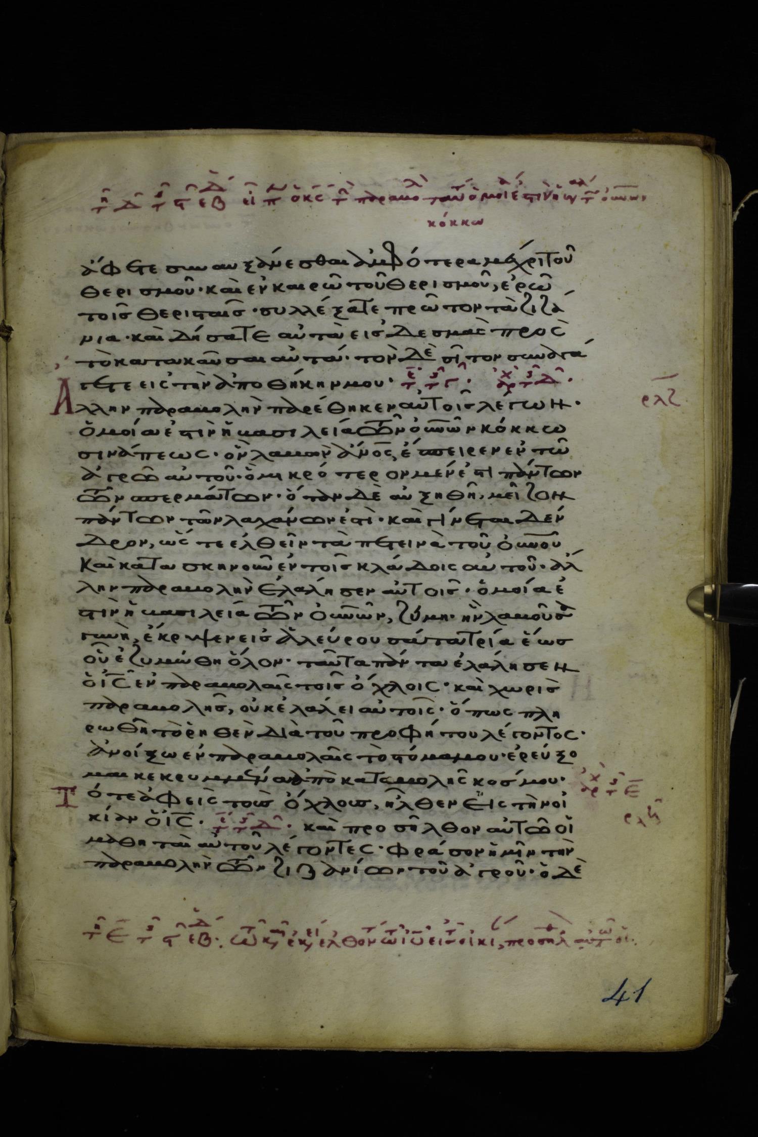 Twelfth or thirteenth century minuscule of the Gospels on parchment; 171 leaves, 1 column, 26-28 lines per column. Images were taken at the National Library of Greece in Athens.