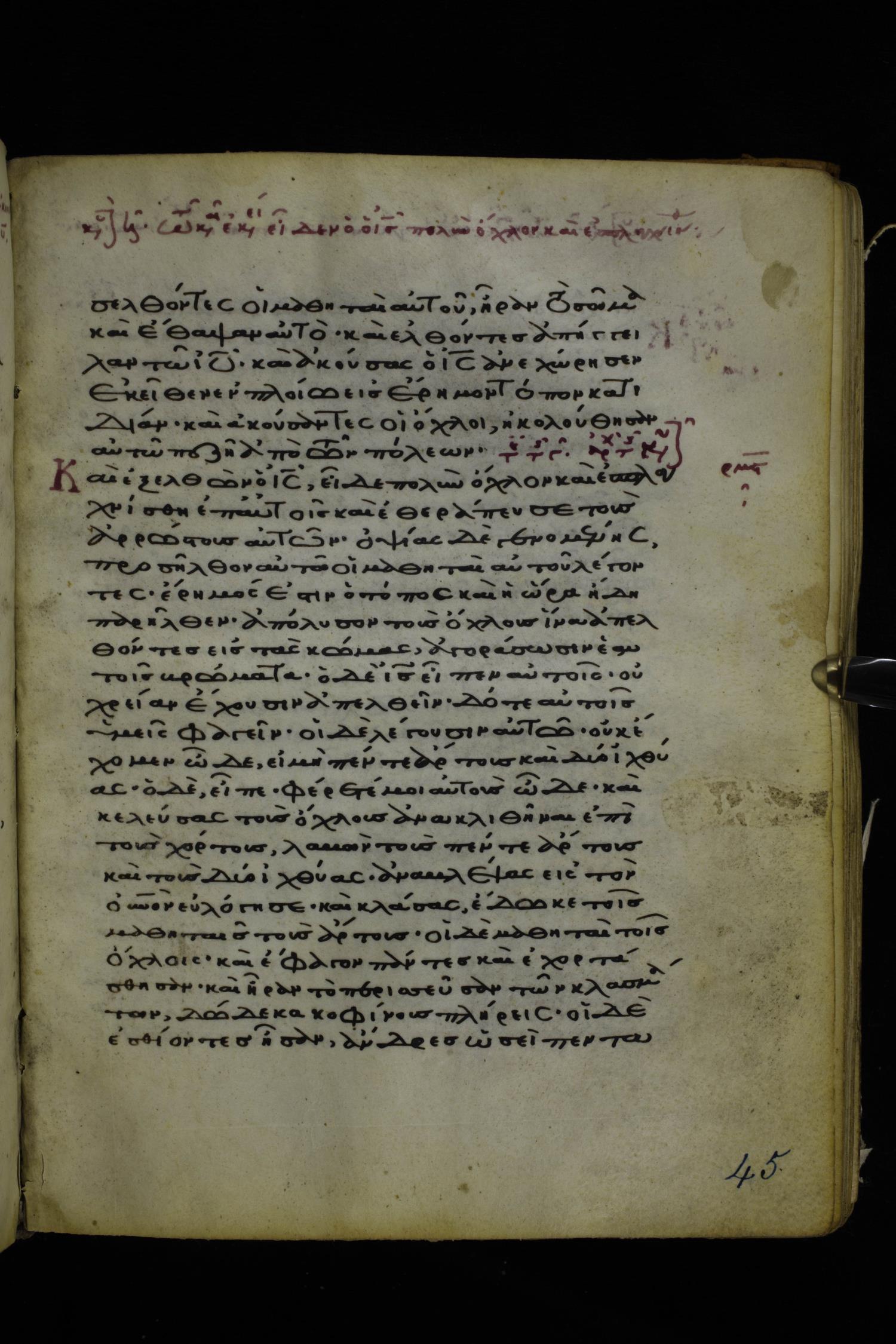 Twelfth or thirteenth century minuscule of the Gospels on parchment; 171 leaves, 1 column, 26-28 lines per column. Images were taken at the National Library of Greece in Athens.