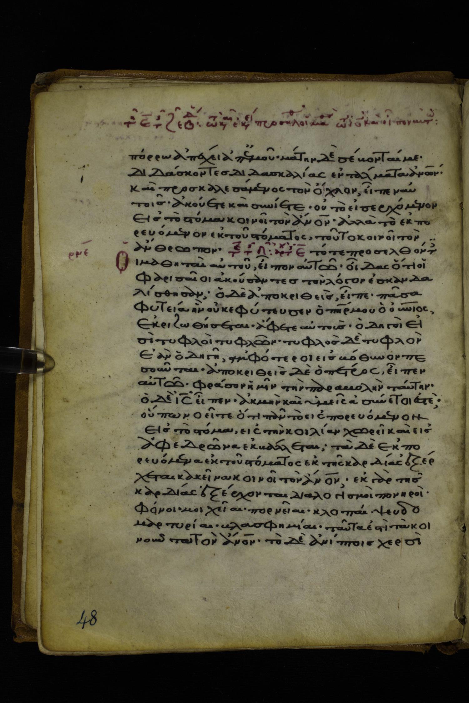 Twelfth or thirteenth century minuscule of the Gospels on parchment; 171 leaves, 1 column, 26-28 lines per column. Images were taken at the National Library of Greece in Athens.