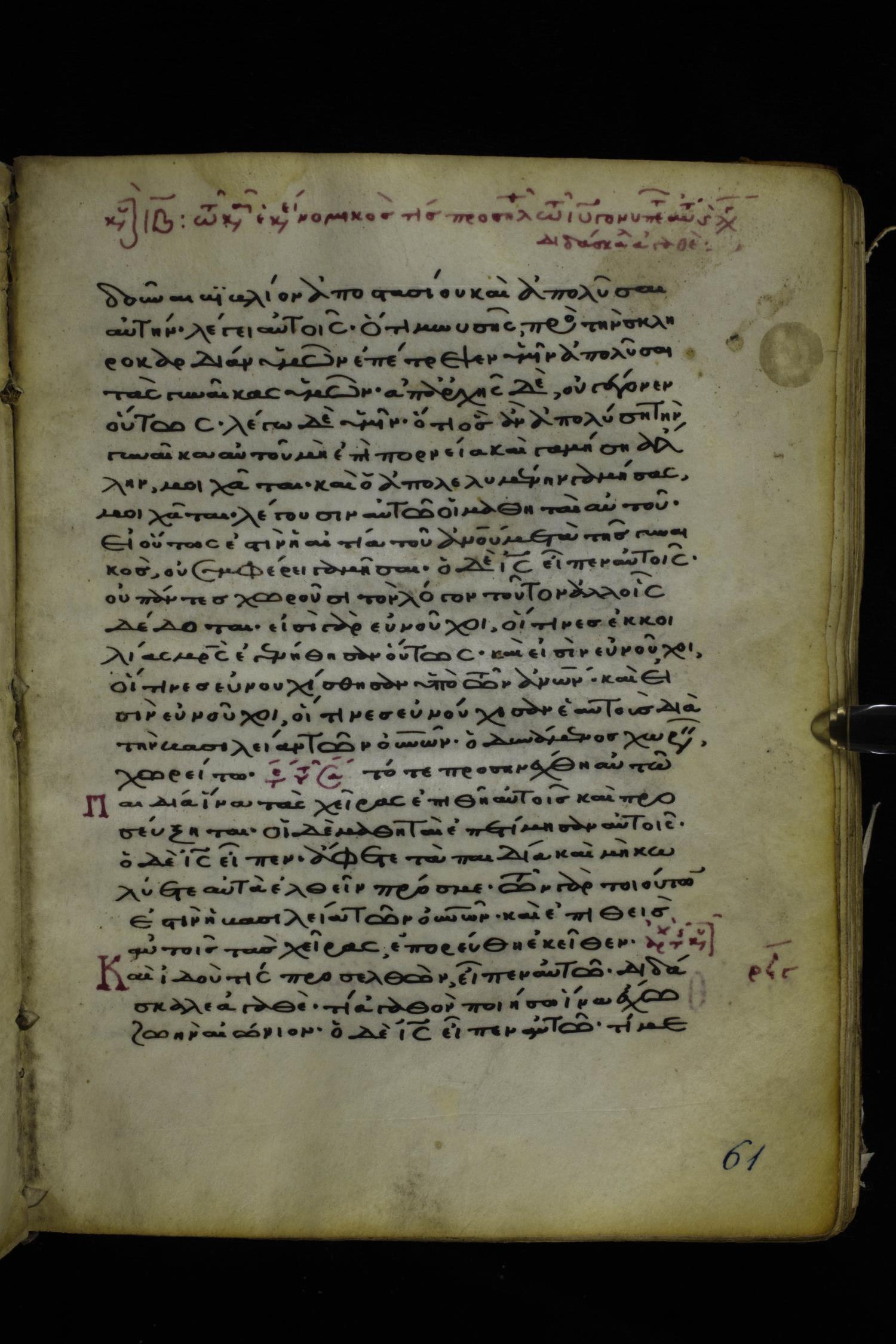 Twelfth or thirteenth century minuscule of the Gospels on parchment; 171 leaves, 1 column, 26-28 lines per column. Images were taken at the National Library of Greece in Athens.