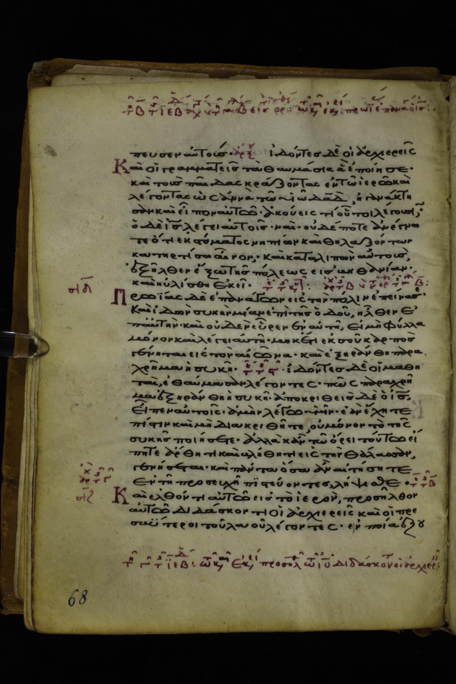 Twelfth or thirteenth century minuscule of the Gospels on parchment; 171 leaves, 1 column, 26-28 lines per column. Images were taken at the National Library of Greece in Athens.
