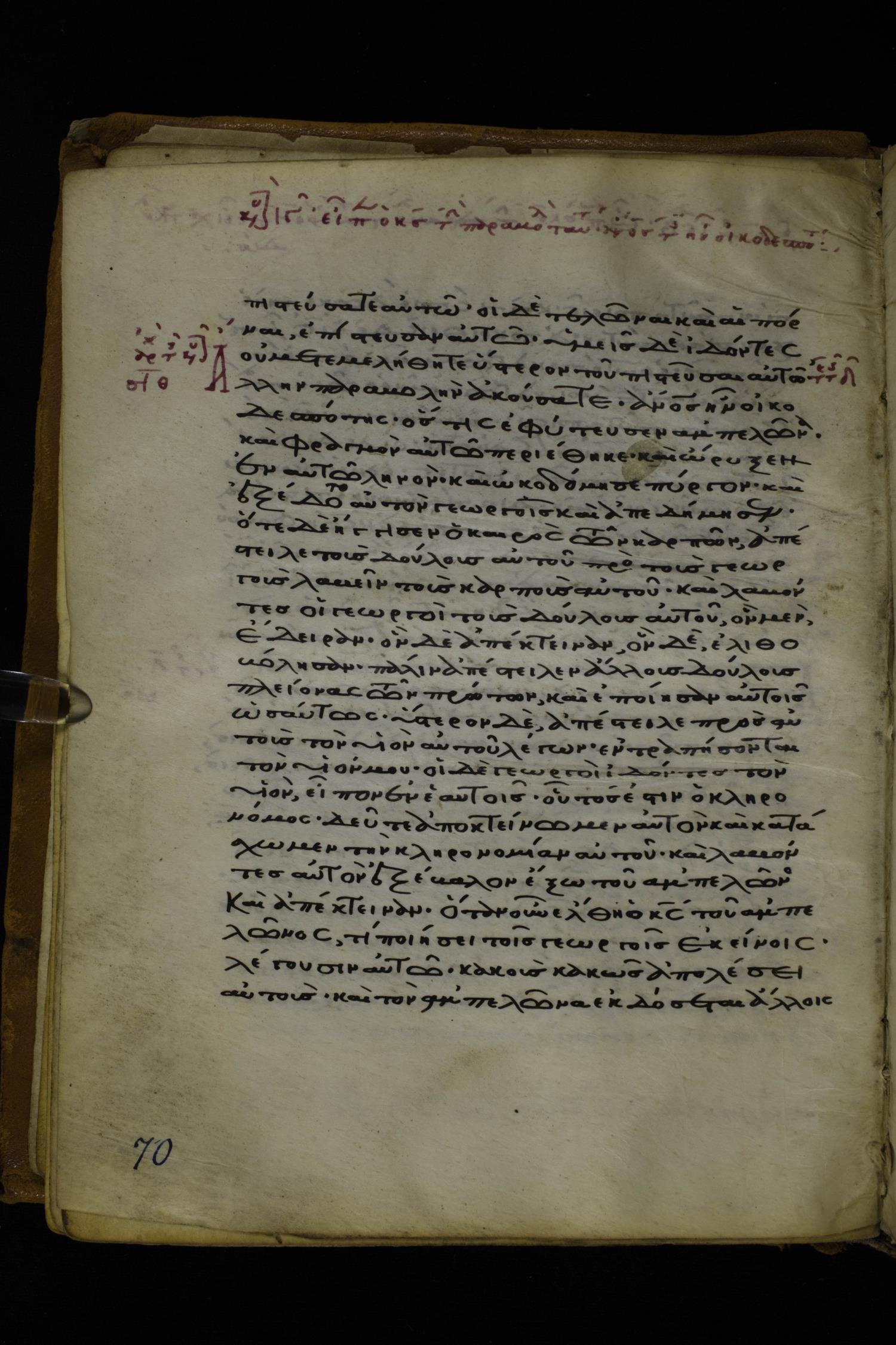Twelfth or thirteenth century minuscule of the Gospels on parchment; 171 leaves, 1 column, 26-28 lines per column. Images were taken at the National Library of Greece in Athens.
