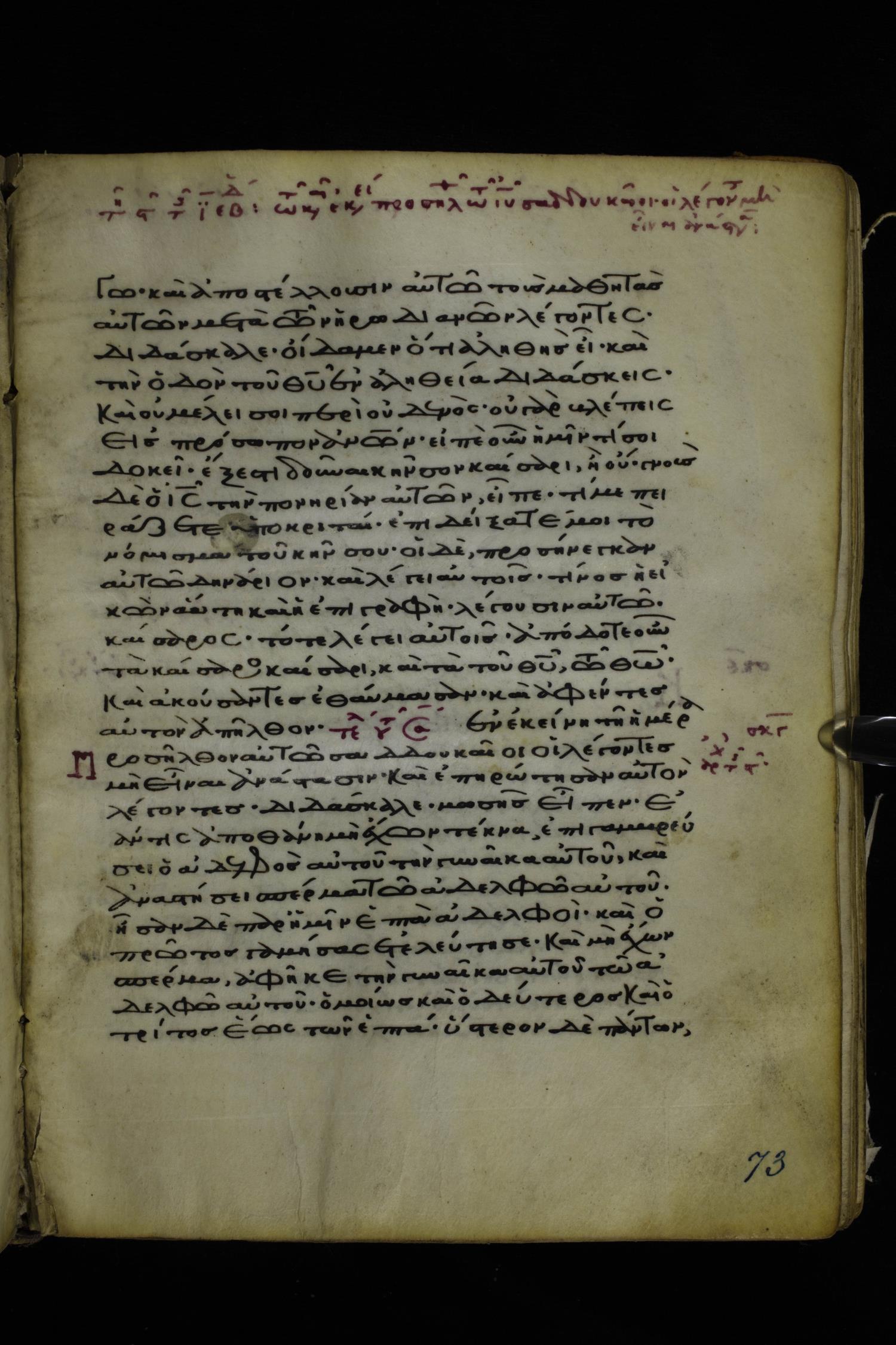 Twelfth or thirteenth century minuscule of the Gospels on parchment; 171 leaves, 1 column, 26-28 lines per column. Images were taken at the National Library of Greece in Athens.