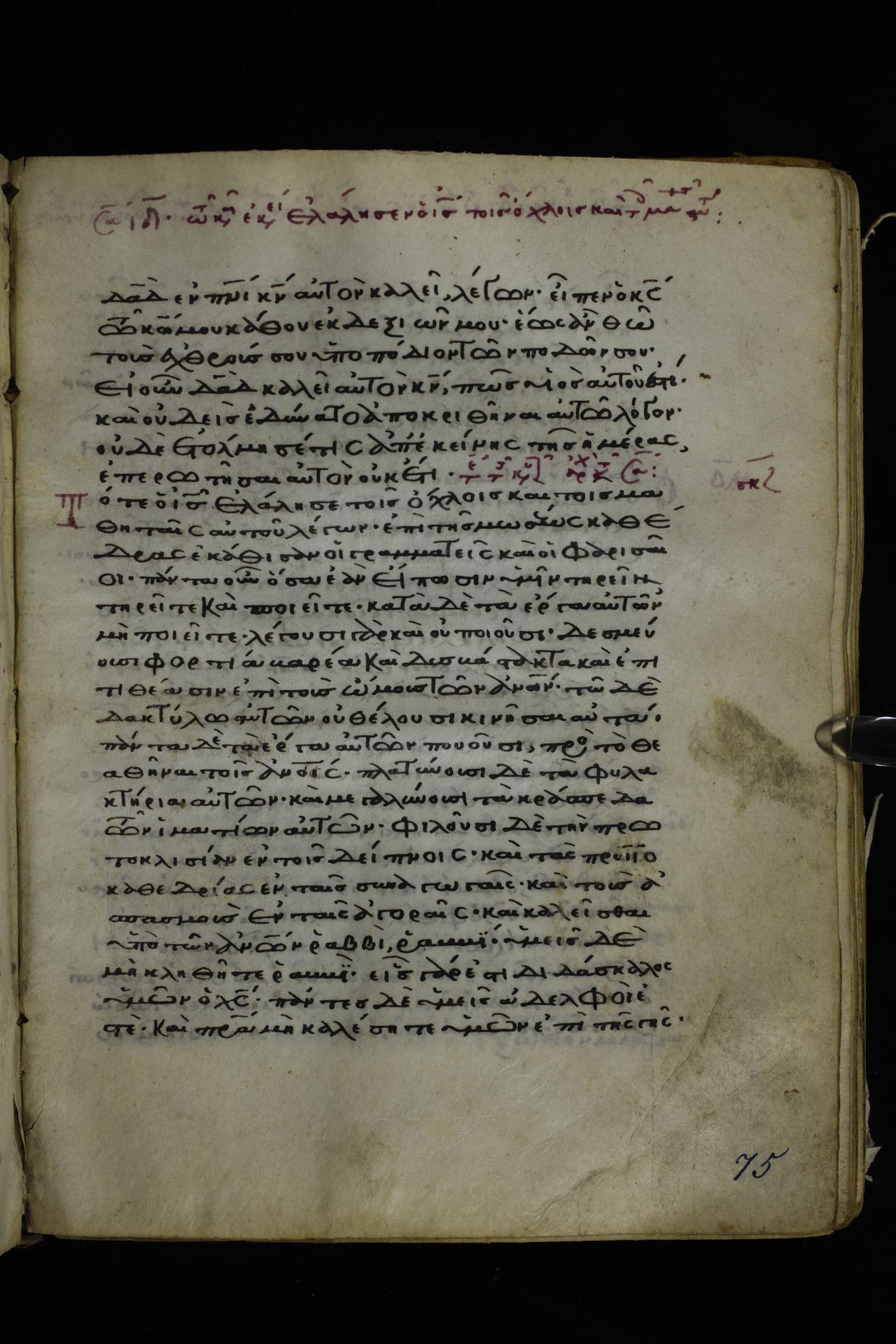 Twelfth or thirteenth century minuscule of the Gospels on parchment; 171 leaves, 1 column, 26-28 lines per column. Images were taken at the National Library of Greece in Athens.