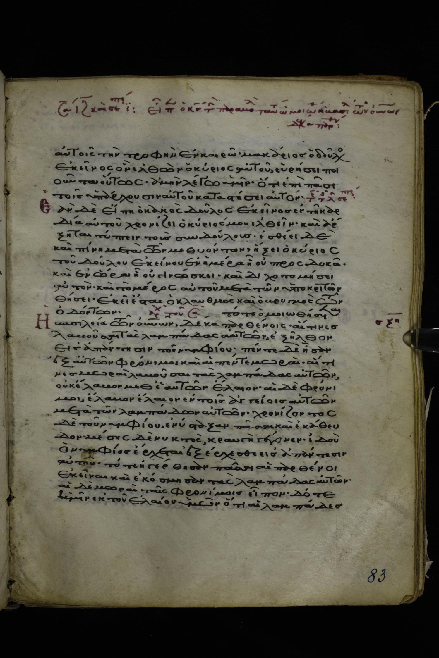 Twelfth or thirteenth century minuscule of the Gospels on parchment; 171 leaves, 1 column, 26-28 lines per column. Images were taken at the National Library of Greece in Athens.