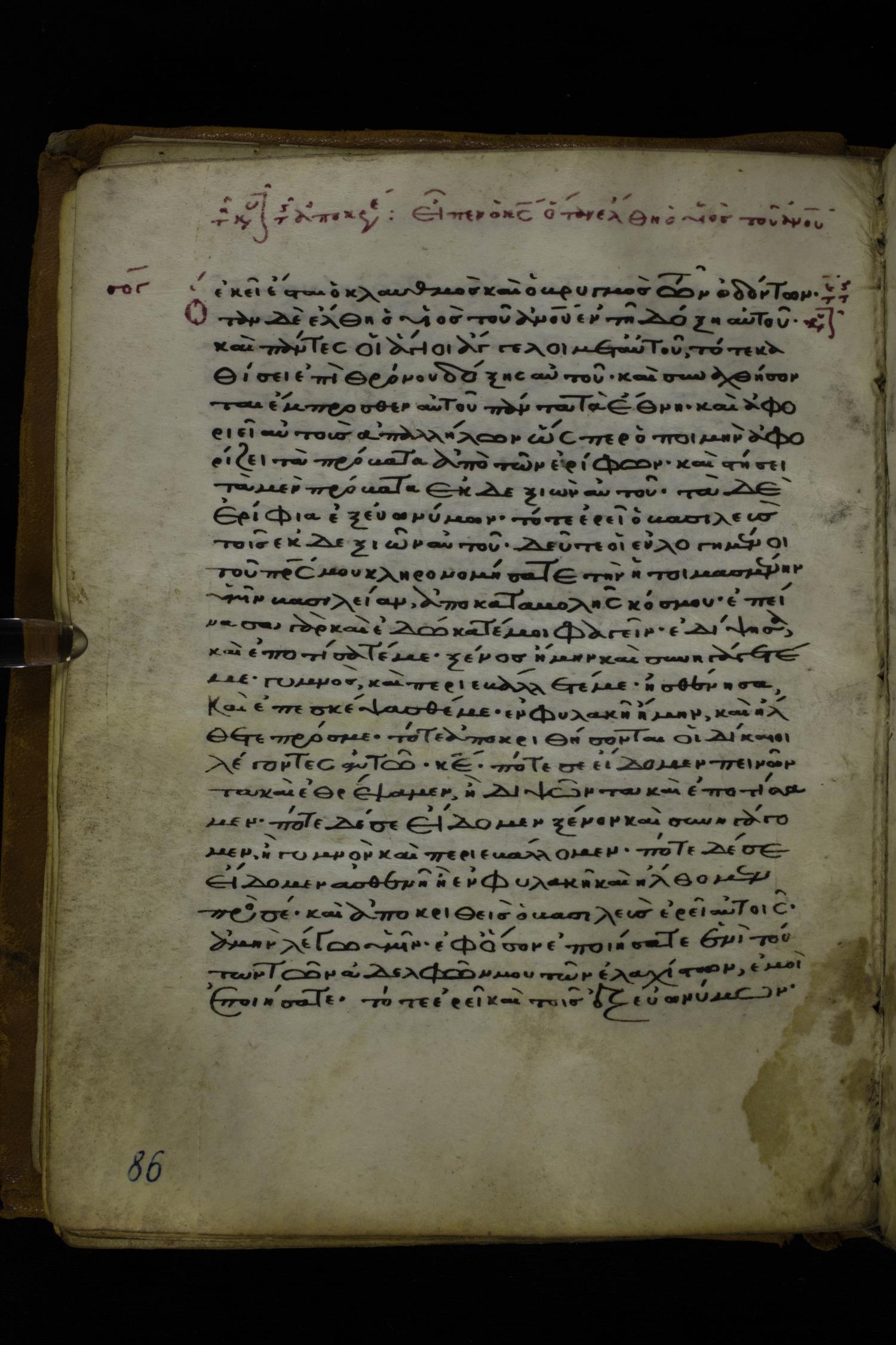 Twelfth or thirteenth century minuscule of the Gospels on parchment; 171 leaves, 1 column, 26-28 lines per column. Images were taken at the National Library of Greece in Athens.