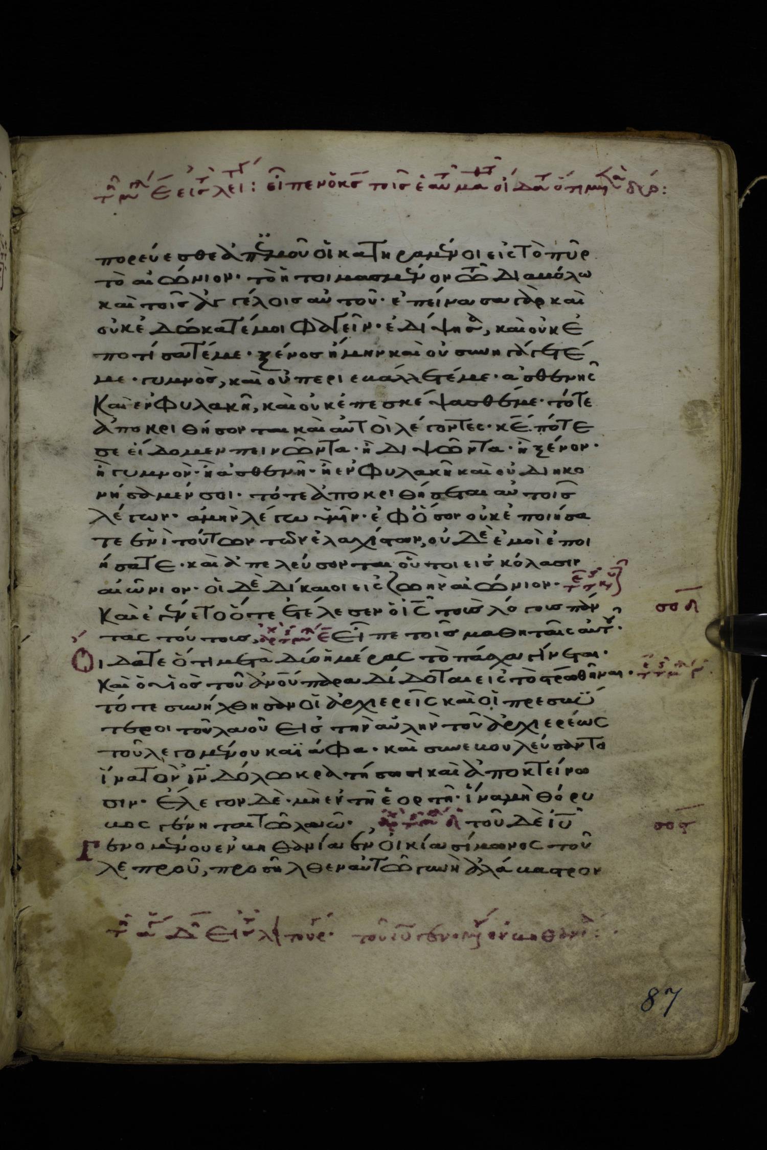 Twelfth or thirteenth century minuscule of the Gospels on parchment; 171 leaves, 1 column, 26-28 lines per column. Images were taken at the National Library of Greece in Athens.
