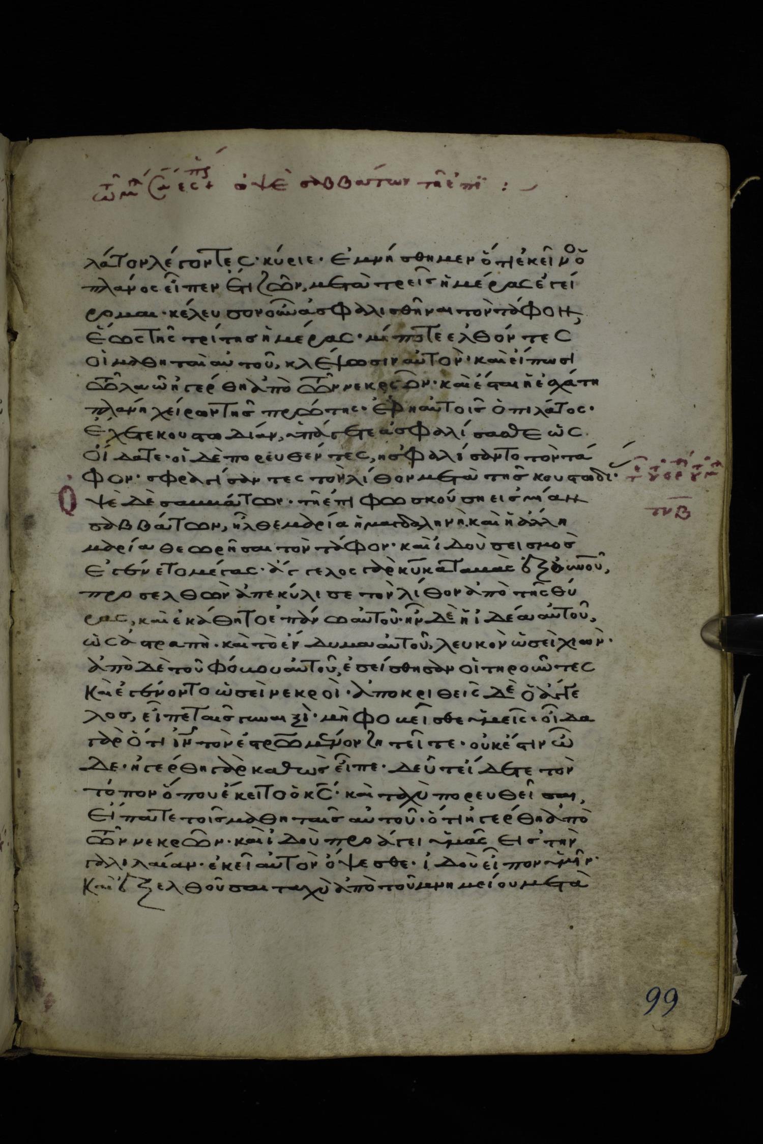 Twelfth or thirteenth century minuscule of the Gospels on parchment; 171 leaves, 1 column, 26-28 lines per column. Images were taken at the National Library of Greece in Athens.