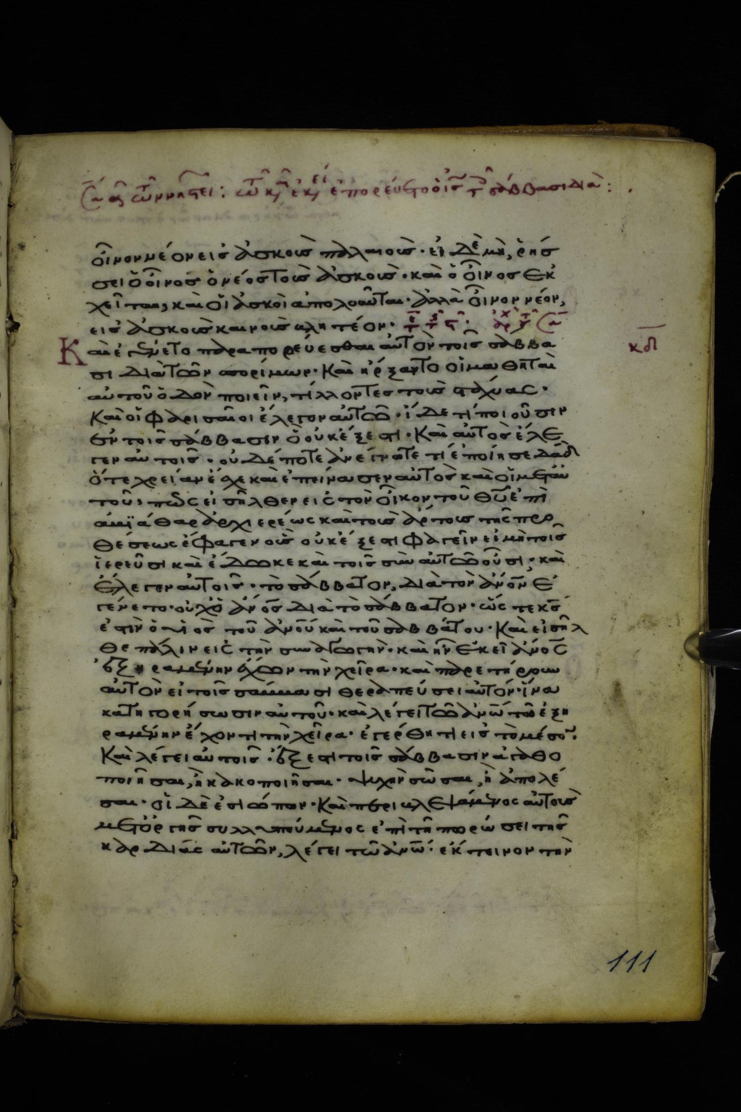 Twelfth or thirteenth century minuscule of the Gospels on parchment; 171 leaves, 1 column, 26-28 lines per column. Images were taken at the National Library of Greece in Athens.