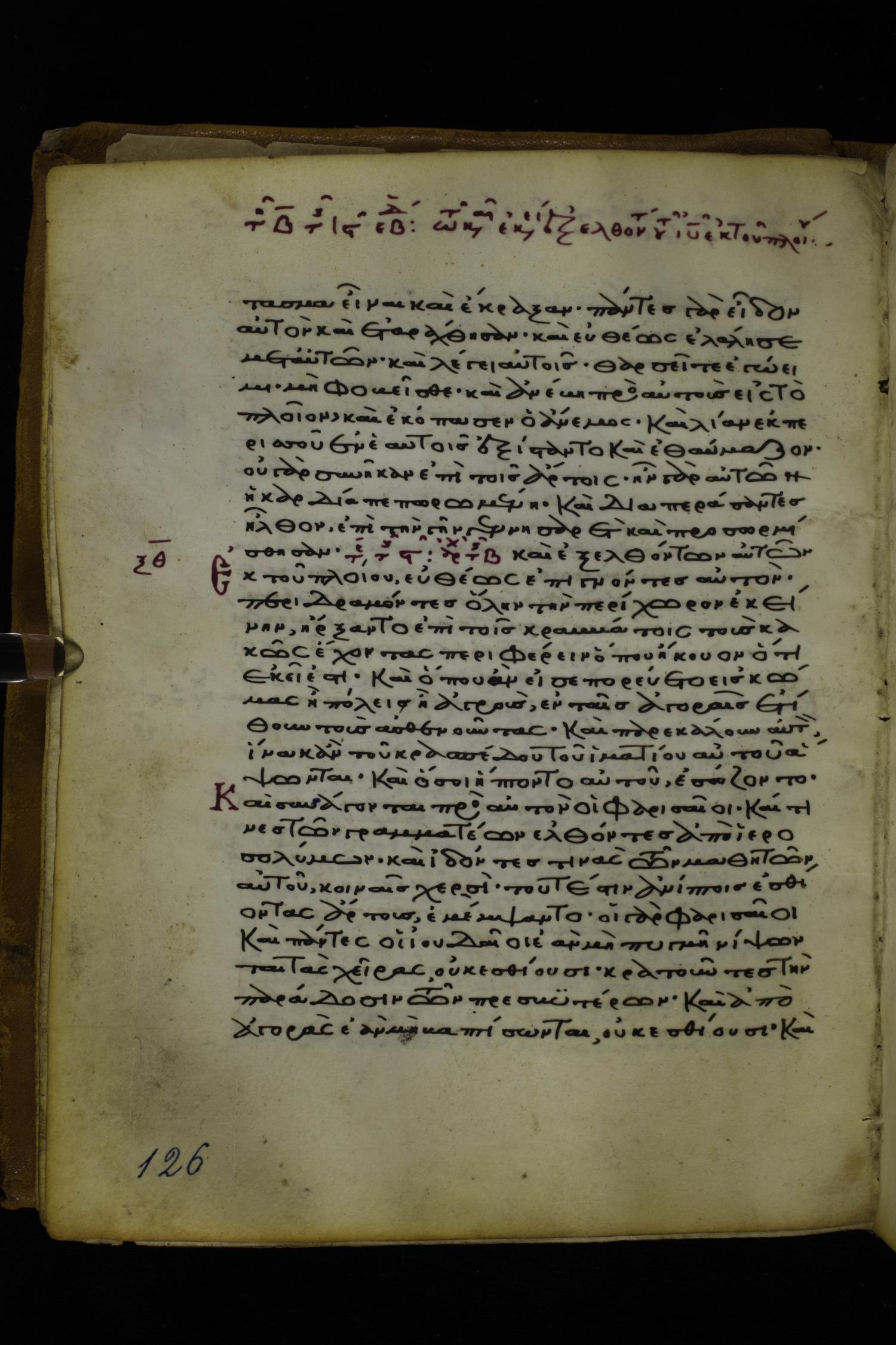 Twelfth or thirteenth century minuscule of the Gospels on parchment; 171 leaves, 1 column, 26-28 lines per column. Images were taken at the National Library of Greece in Athens.