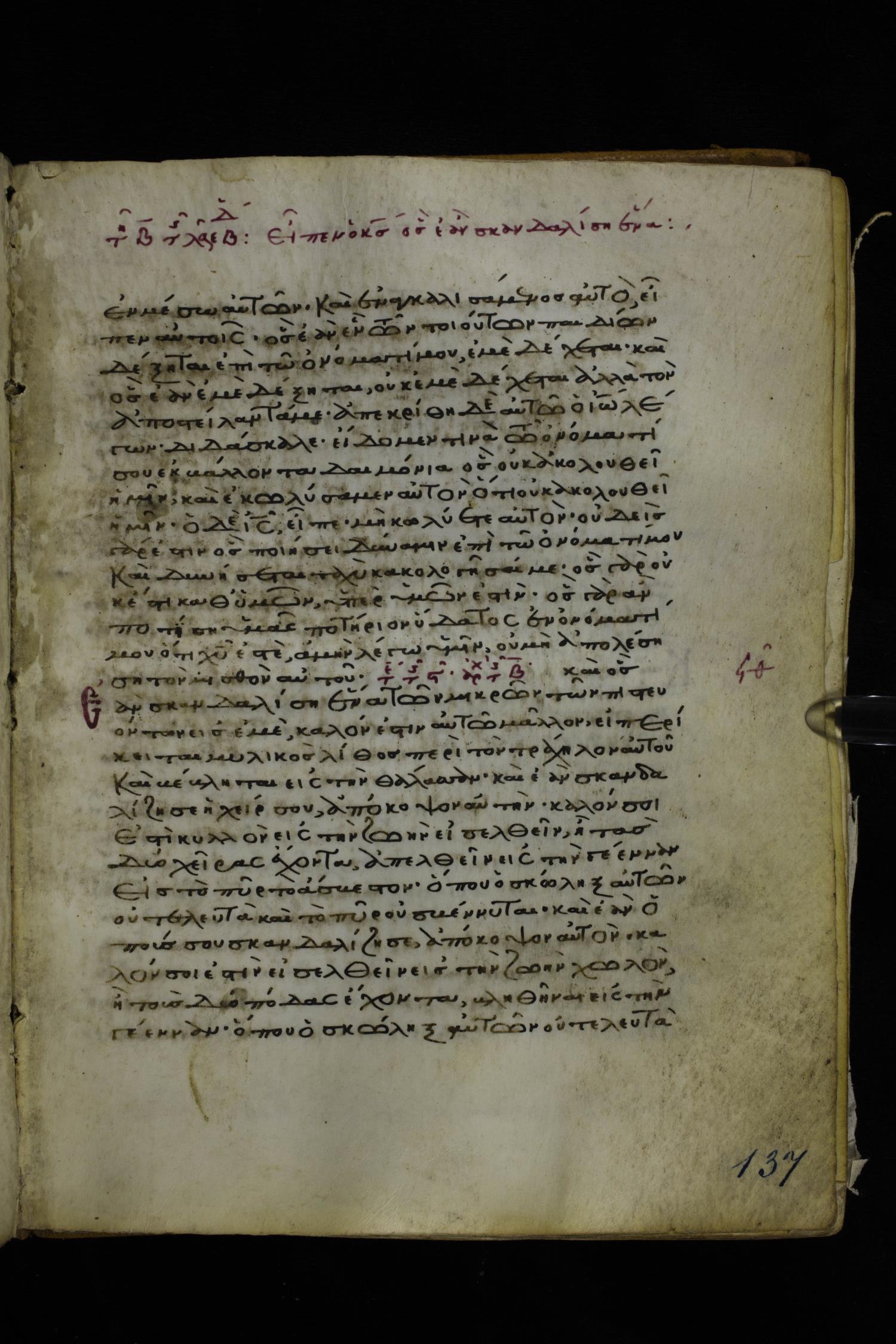 Twelfth or thirteenth century minuscule of the Gospels on parchment; 171 leaves, 1 column, 26-28 lines per column. Images were taken at the National Library of Greece in Athens.