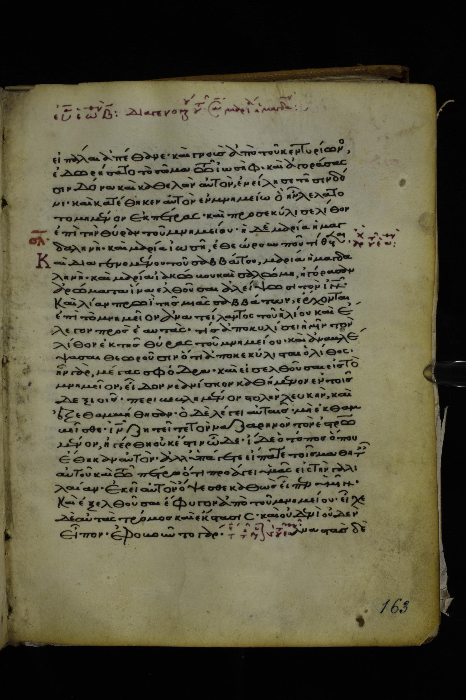 Twelfth or thirteenth century minuscule of the Gospels on parchment; 171 leaves, 1 column, 26-28 lines per column. Images were taken at the National Library of Greece in Athens.