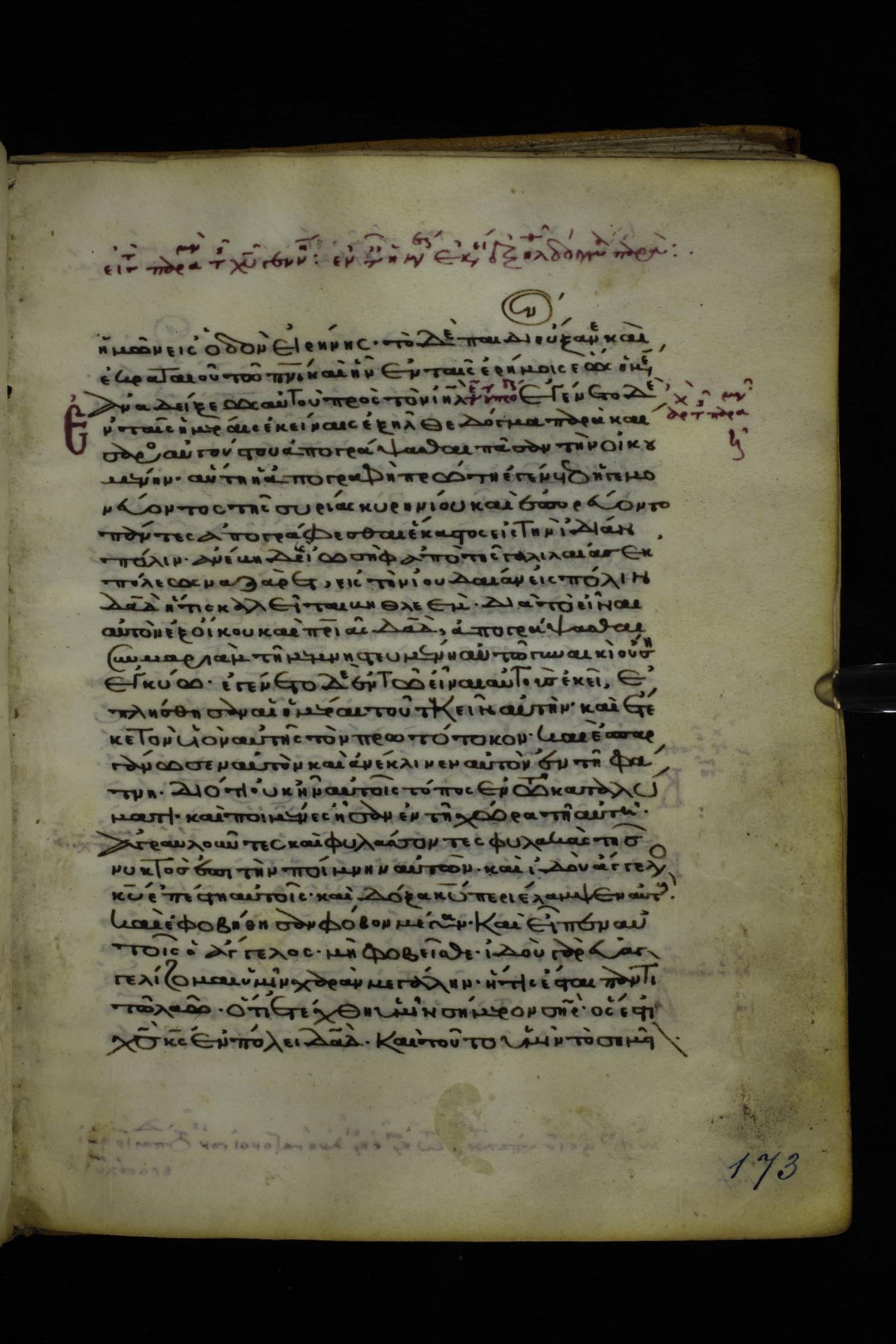 Twelfth or thirteenth century minuscule of the Gospels on parchment; 171 leaves, 1 column, 26-28 lines per column. Images were taken at the National Library of Greece in Athens.