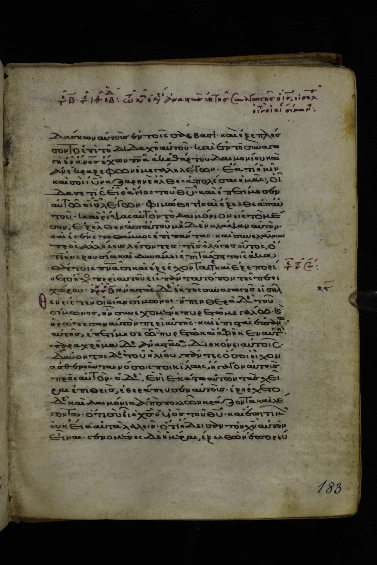 Twelfth or thirteenth century minuscule of the Gospels on parchment; 171 leaves, 1 column, 26-28 lines per column. Images were taken at the National Library of Greece in Athens.