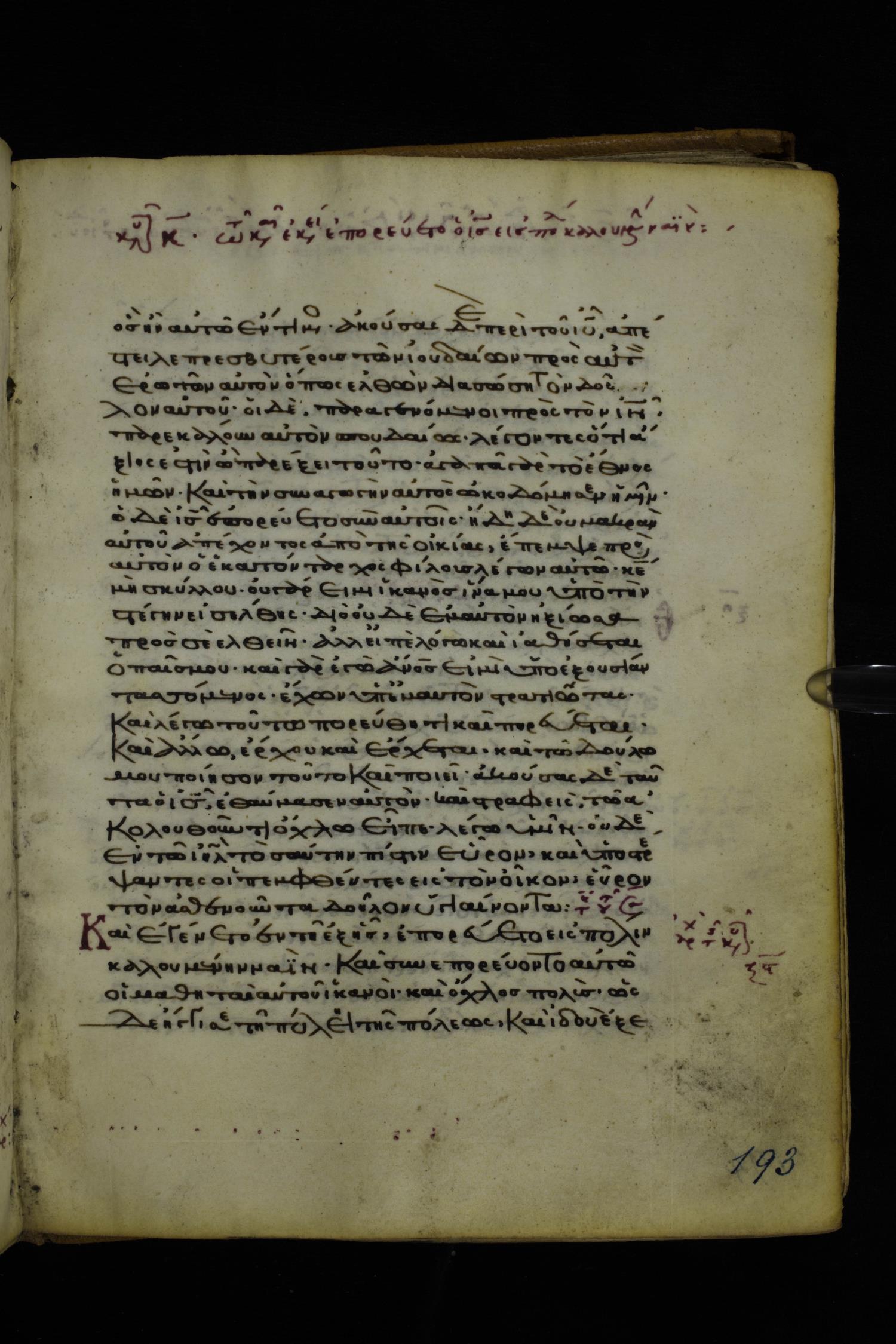Twelfth or thirteenth century minuscule of the Gospels on parchment; 171 leaves, 1 column, 26-28 lines per column. Images were taken at the National Library of Greece in Athens.