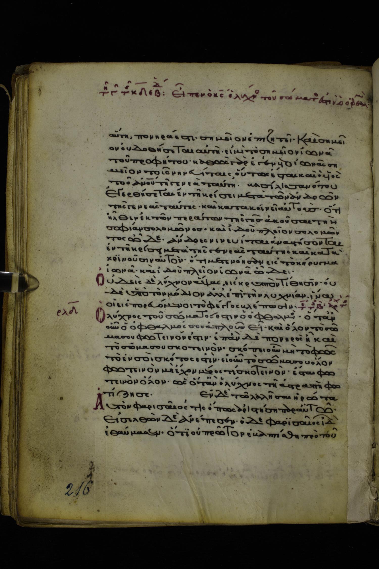 Twelfth or thirteenth century minuscule of the Gospels on parchment; 171 leaves, 1 column, 26-28 lines per column. Images were taken at the National Library of Greece in Athens.