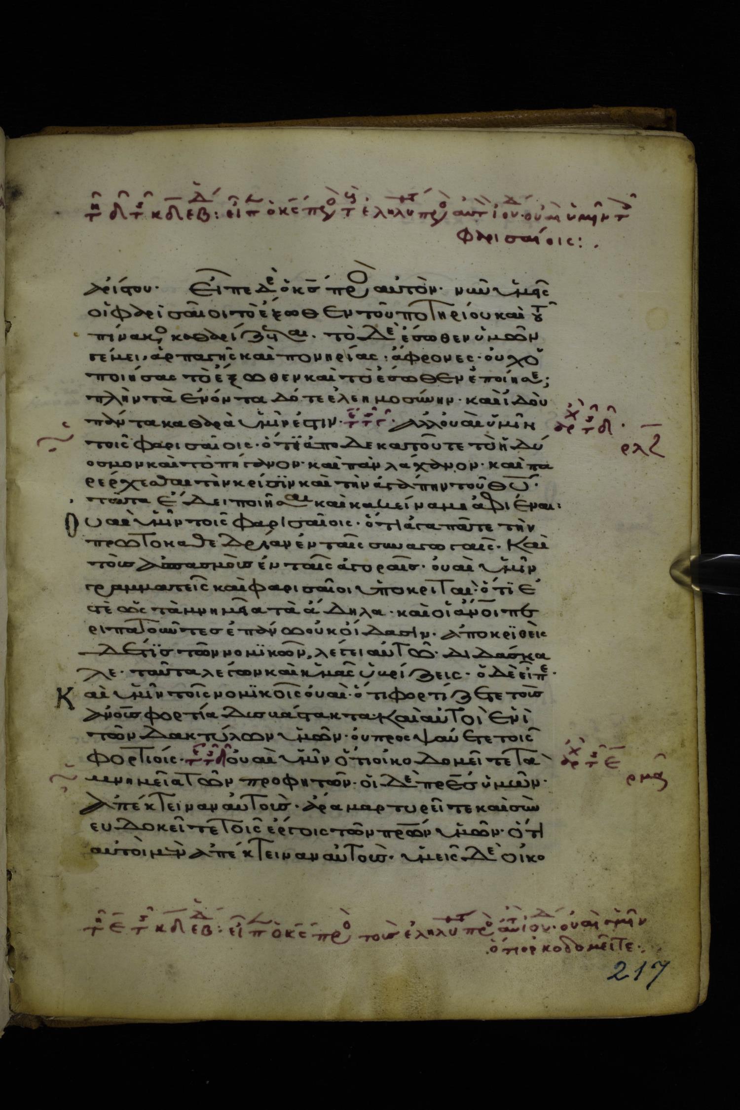 Twelfth or thirteenth century minuscule of the Gospels on parchment; 171 leaves, 1 column, 26-28 lines per column. Images were taken at the National Library of Greece in Athens.