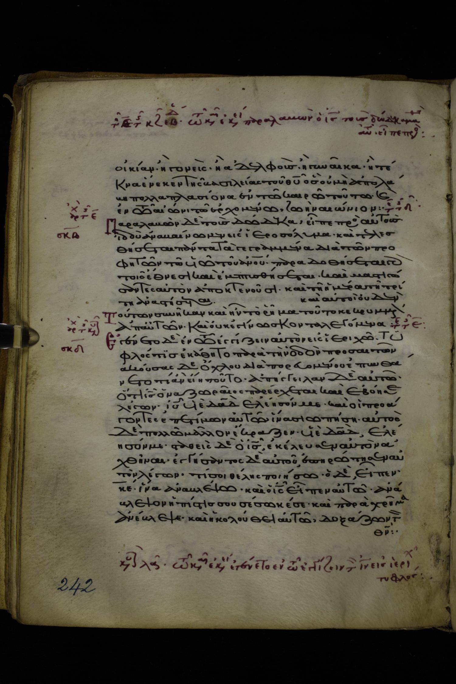 Twelfth or thirteenth century minuscule of the Gospels on parchment; 171 leaves, 1 column, 26-28 lines per column. Images were taken at the National Library of Greece in Athens.