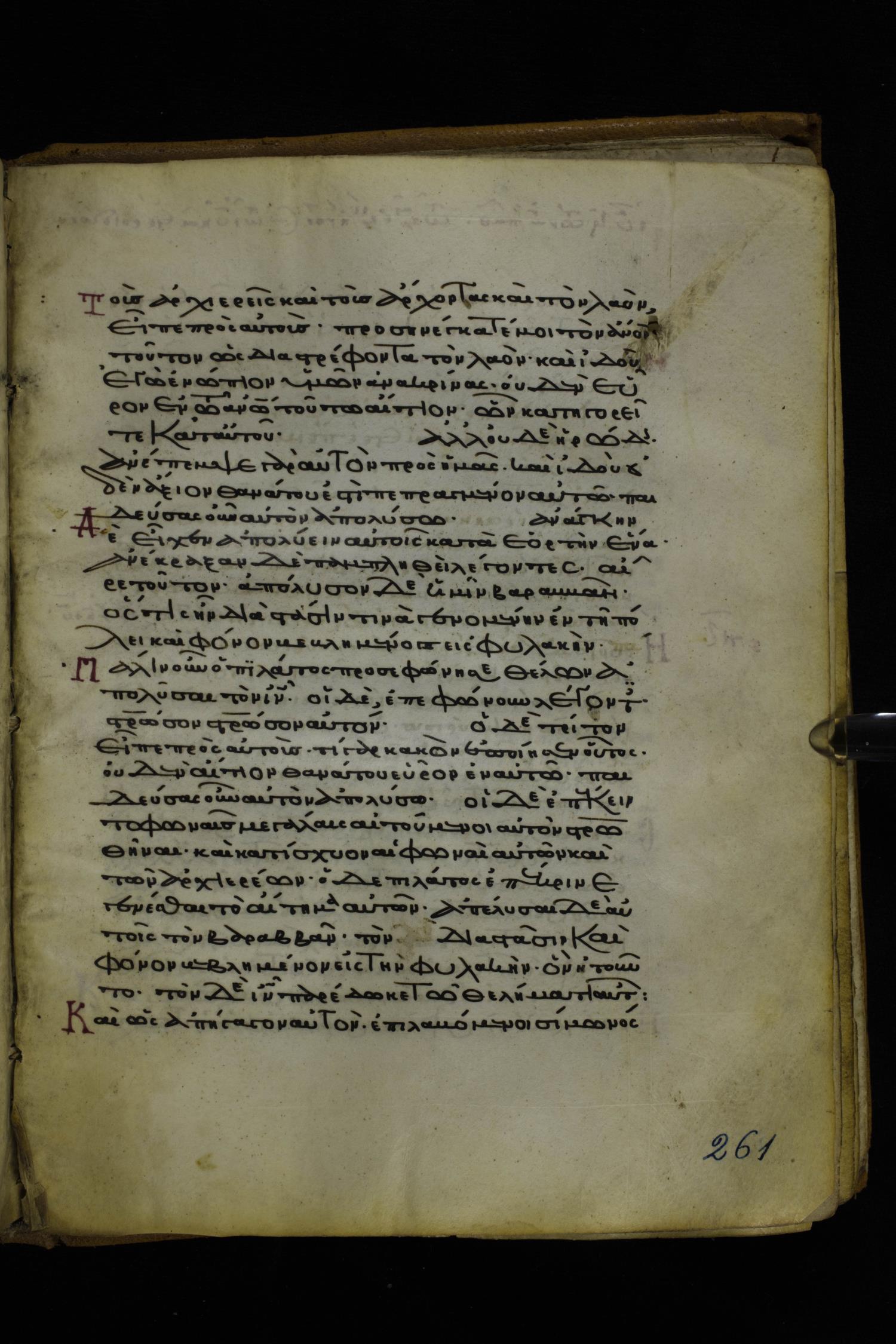 Twelfth or thirteenth century minuscule of the Gospels on parchment; 171 leaves, 1 column, 26-28 lines per column. Images were taken at the National Library of Greece in Athens.