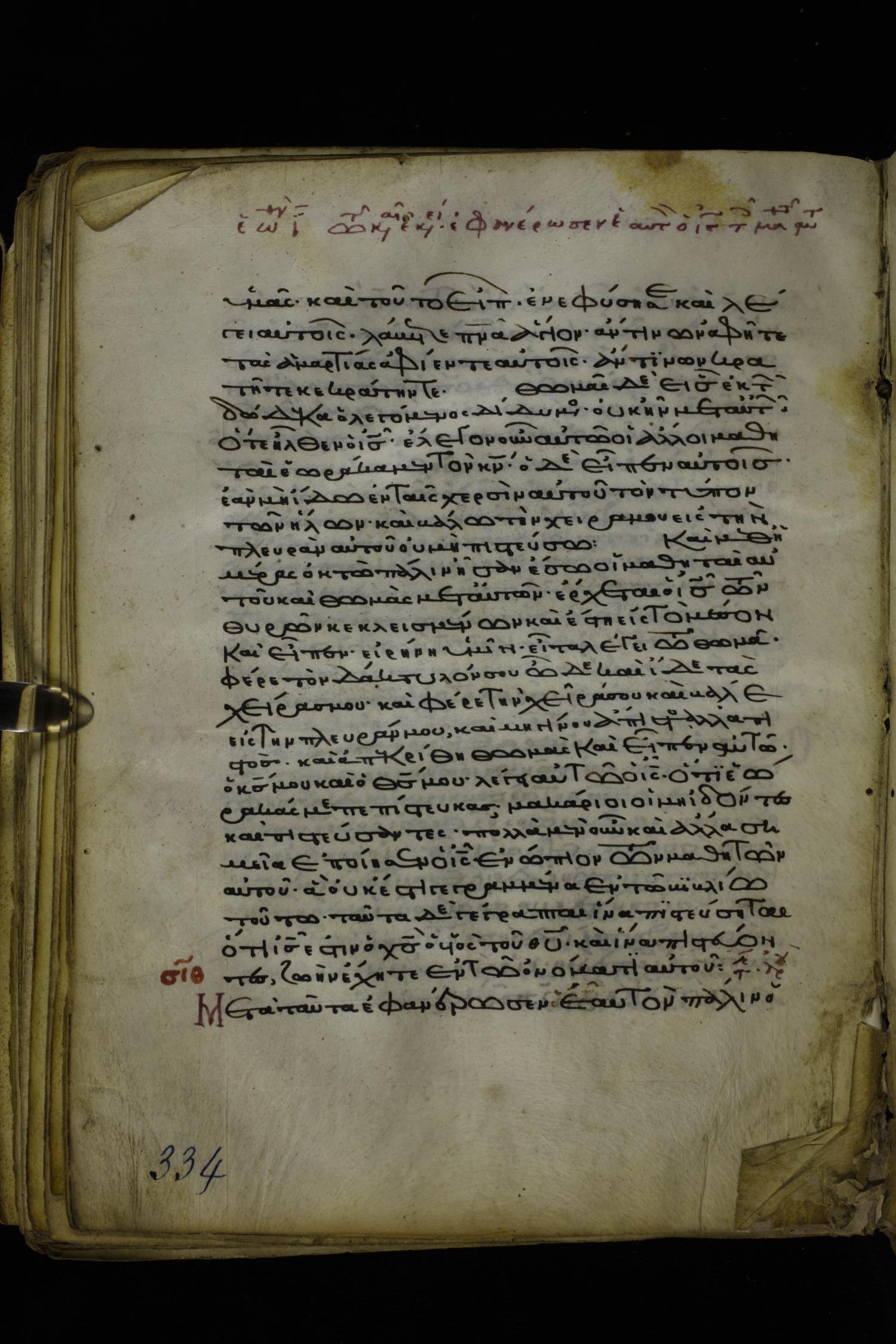 Twelfth or thirteenth century minuscule of the Gospels on parchment; 171 leaves, 1 column, 26-28 lines per column. Images were taken at the National Library of Greece in Athens.