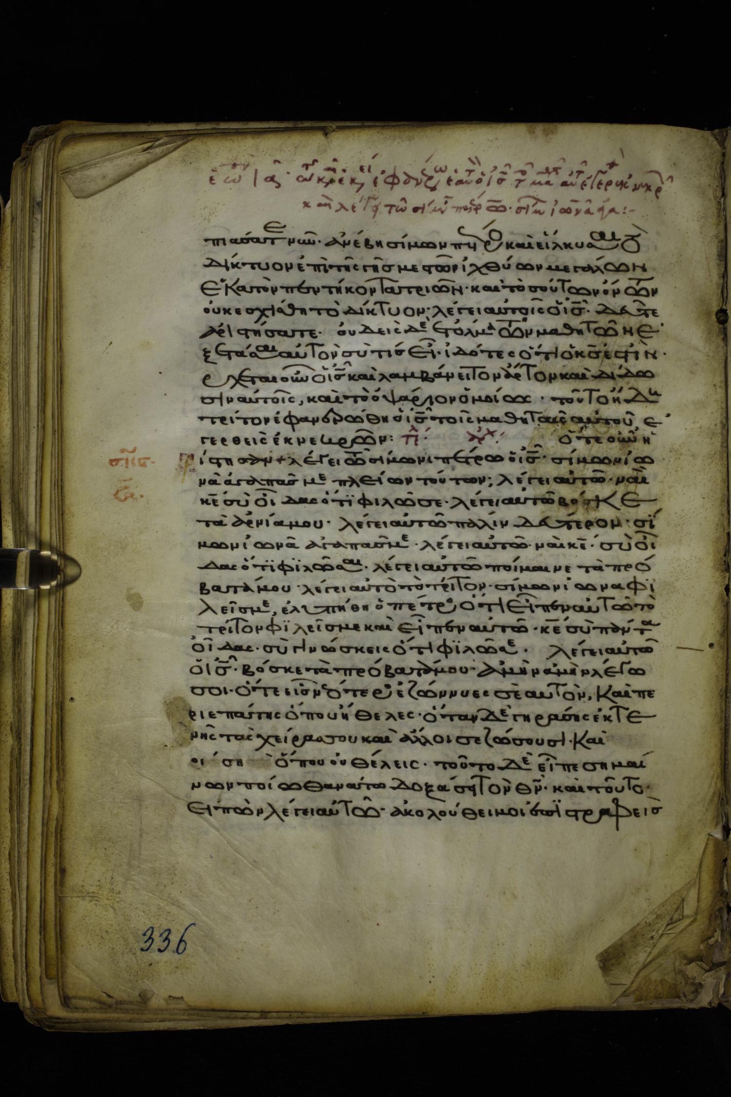 λέγει αὐτῷ τὸ τρίτον Σίμων Ἰωάνου / Ἰωάννου, φιλεῖς με; ἐλυπήθη ὁ Πέτρος ὅτι εἶπεν αὐτῷ τὸ τρίτον Φιλεῖς με; καὶ εἶπεν / λέγει αὐτῷ Κύριε, πάντα σὺ οἶδας, σὺ γινώσκεις ὅτι φιλῶ σε. λέγει αὐτῷ {ὁ} Ἰησοῦς Βόσκε τὰ προβάτιά / πρόβατά μου.