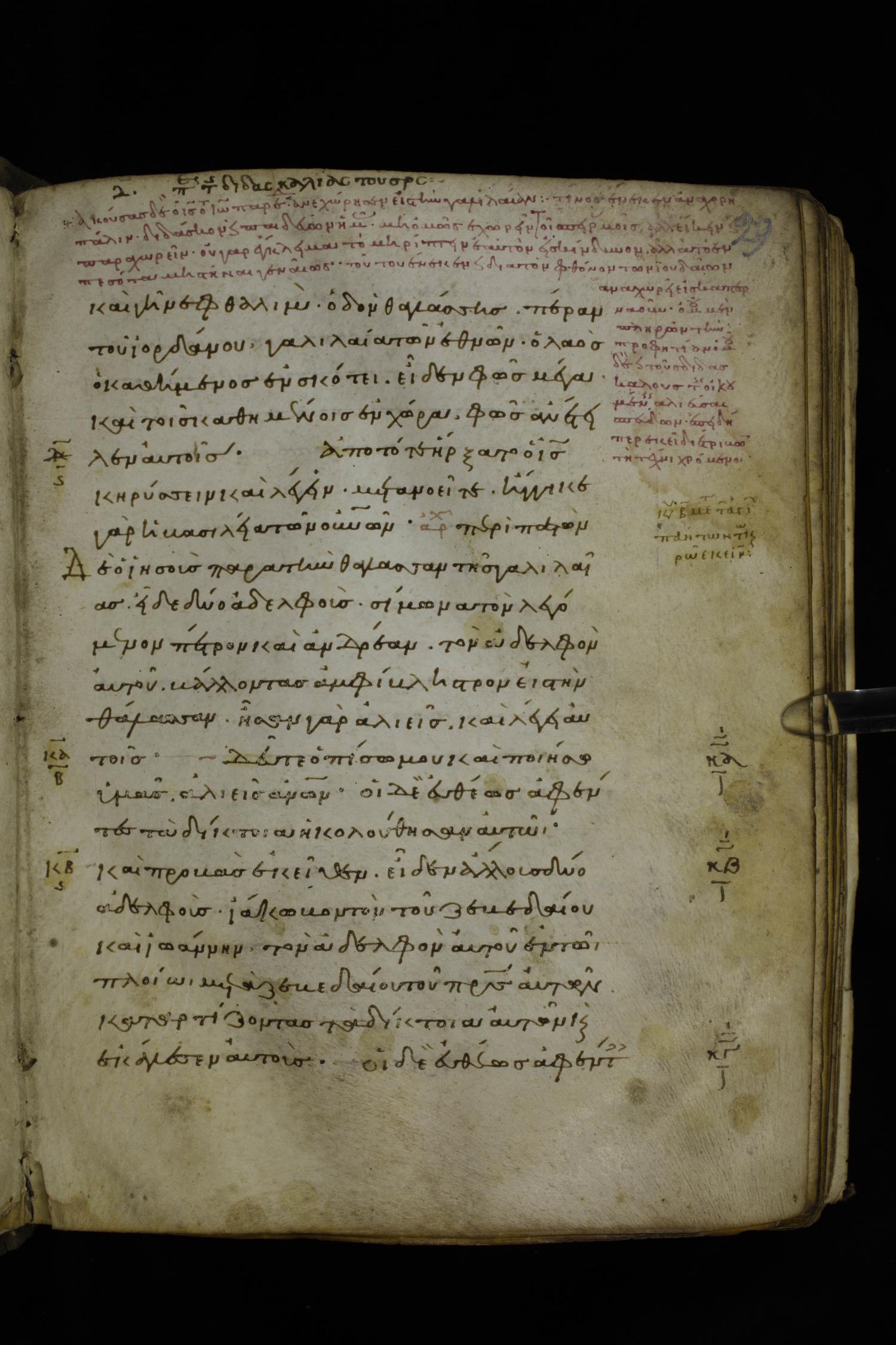 Eleventh century minuscule of the Gospels on parchment; 241 leaves, 1 column, 22 lines per column. Images were taken at the National Library of Greece in Athens.